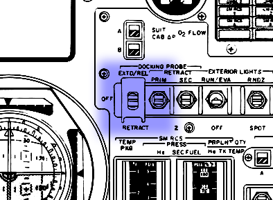 The tripod shaped CM docking probe has now been extended from its retracted launch configuration, in readiness for the transposition and docking with the LM, which will occur shortly after the TLI burn. If this extension had failed, then no docking with the LM 'Snoopy' could have occurred and an alternative mission plan would have had to be adopted.