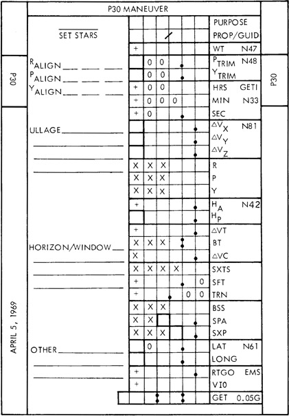 Gene has copied all the information onto a form that exactly matches the one which Duke was reading from. This version is from the Apollo 11 Flight Plan.