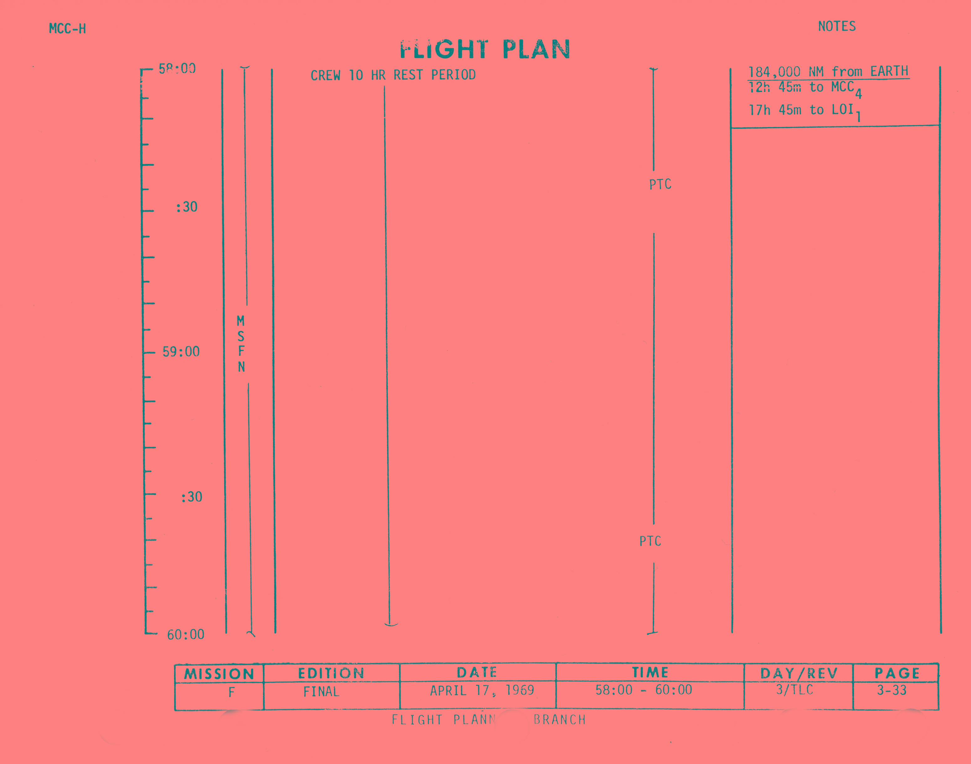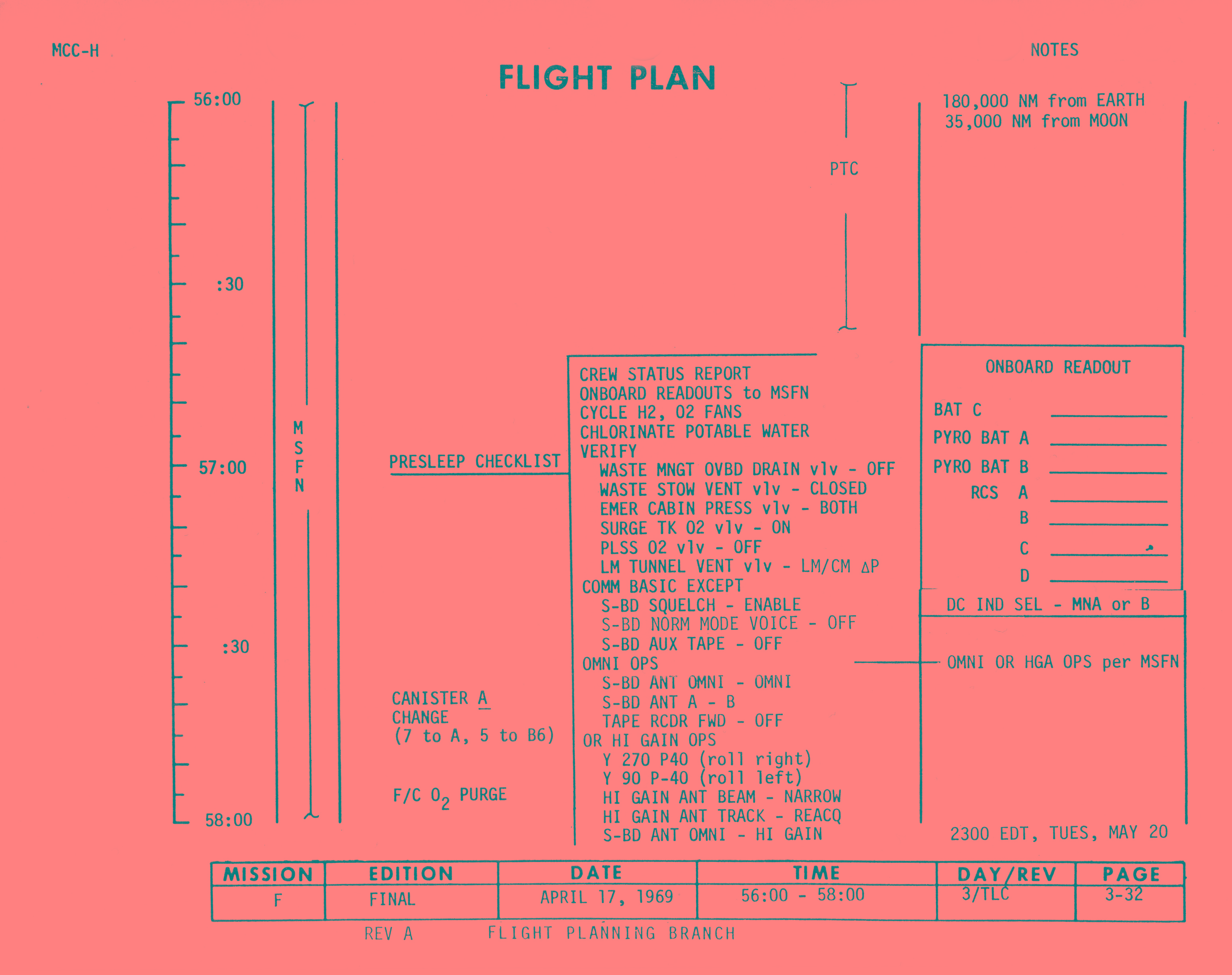 053:49:00 Young: Okay. It may sound like we've been loafing for the past couple of days, but we haven't. We've been real busy, and every spare minute we get we study our Flight Plan. So you see that pretty soon we're going to be going into orbit, and we have a completely different set of operations to go into that shows our pitch profile all around the Moon, for the first revolution. Tomorrow's a big day, and we're very much looking for it. Even though we're about 180,000 miles [333,000 km] away from the Earth here, you never get away from studying.