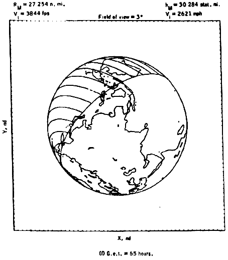 This is Apollo Control. We have several minutes of dead air here in which there is no conversation taking place with the crew of Apollo 10. Now some 11,390 nautical miles [21,094 km] away from the Moon, traveling at a velocity of 4,153 feet per second [1,266 m/s]. Some 4 hours, 12 minutes remaining until Loss Of Signal with the spacecraft when it goes behind the western rim of the Moon, as viewed from Earth. The Black Team of flight controllers is now being briefed by their predecessors here in Mission Control Center with handover due in about 5 minutes. In Ground Elapsed Time, the Loss Of Signal at some 4 hours and 12 minutes from now will be at 75 hours, 68 minutes, 24 seconds out of Goldstone. Out of Madrid some 10 seconds later, 75:48:34. We'll continue to monitor air-to-ground for resumption of conversation.