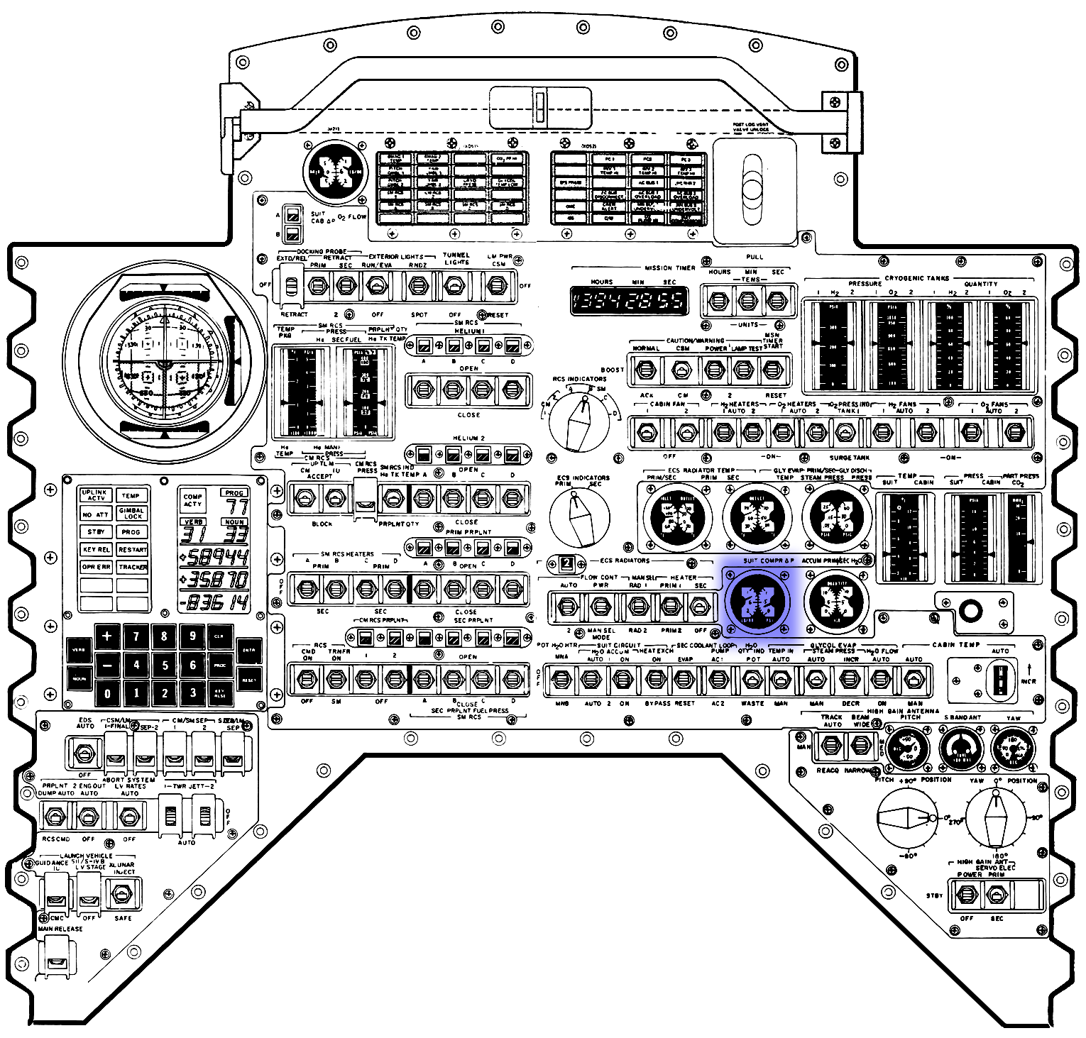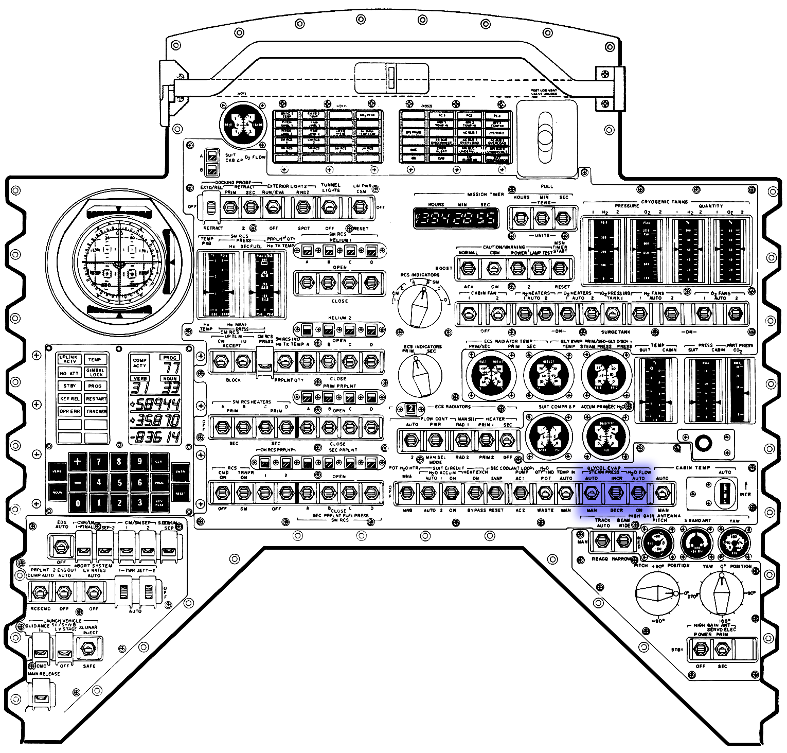 As part of the P52 CM IMU realignment procedure the crew after making the required star sightings the CMC will bring up the required gyro torquing angles displayed as a flashing Verb 06 Noun 93. John Young is highlighting how little the platform has drifted during the night and the small torquing angle values required.