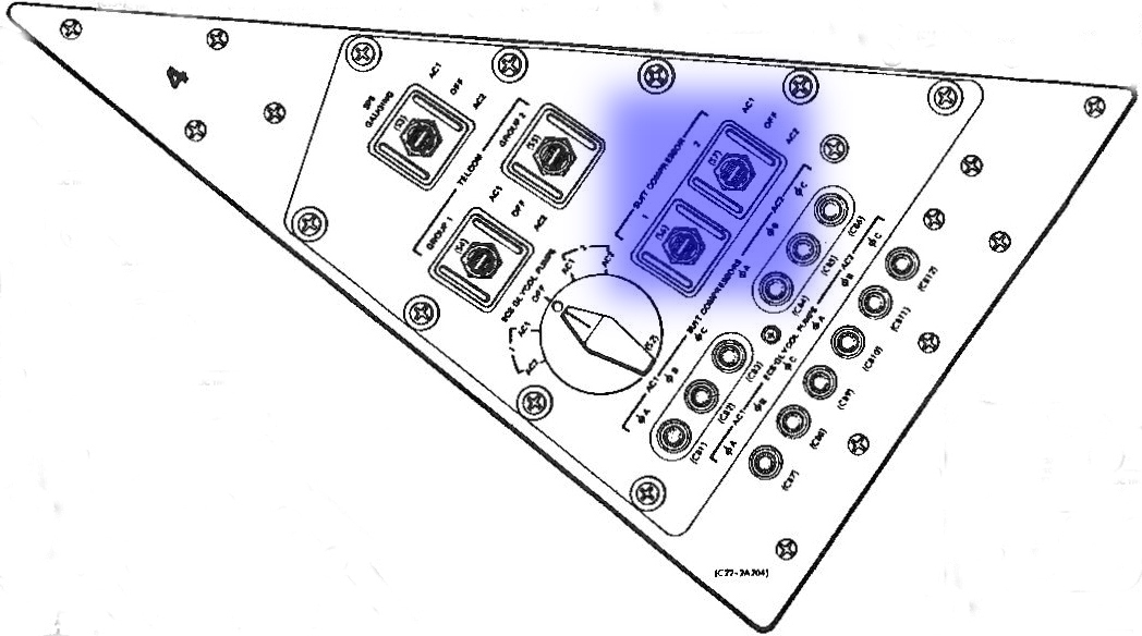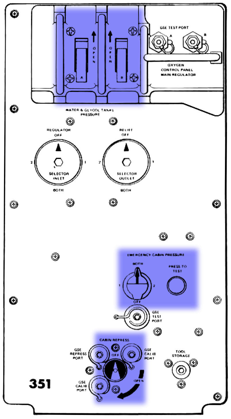Main cabin repress & Emergency cabin pressure controls on panel 351 in LH equipment bay.