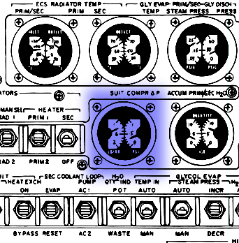 Suit compressor. Switch to the other compressor and confirm the output of this compressor is within a delta-P (pressure difference) of 0.3 to 0.4 psid.