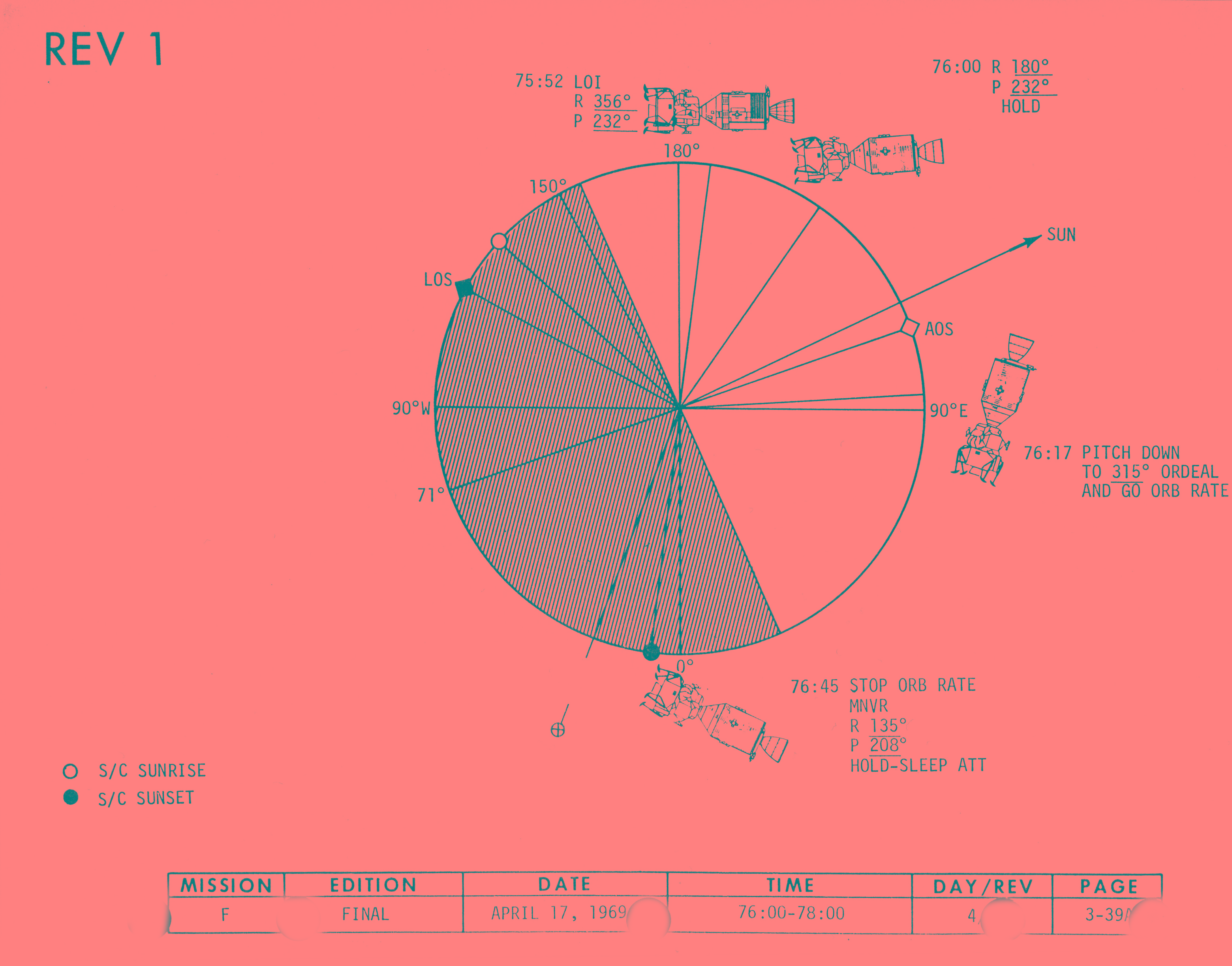 076:32:14 Cernan: Okay. Rev 2 is 77:47:59, 77:58:27, and 78:31:19. Sunrise is 77:51:40, sunset is 79:13:33.