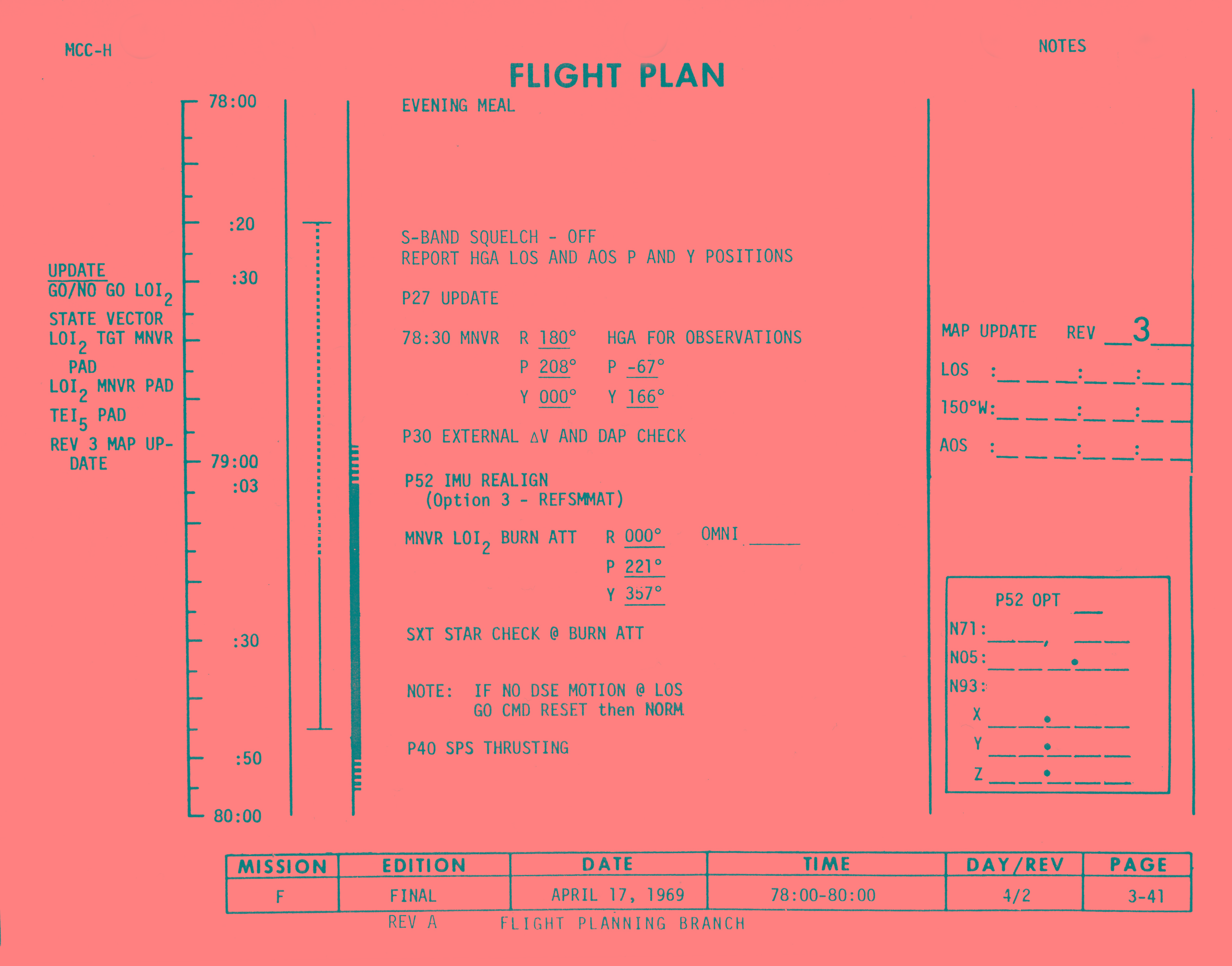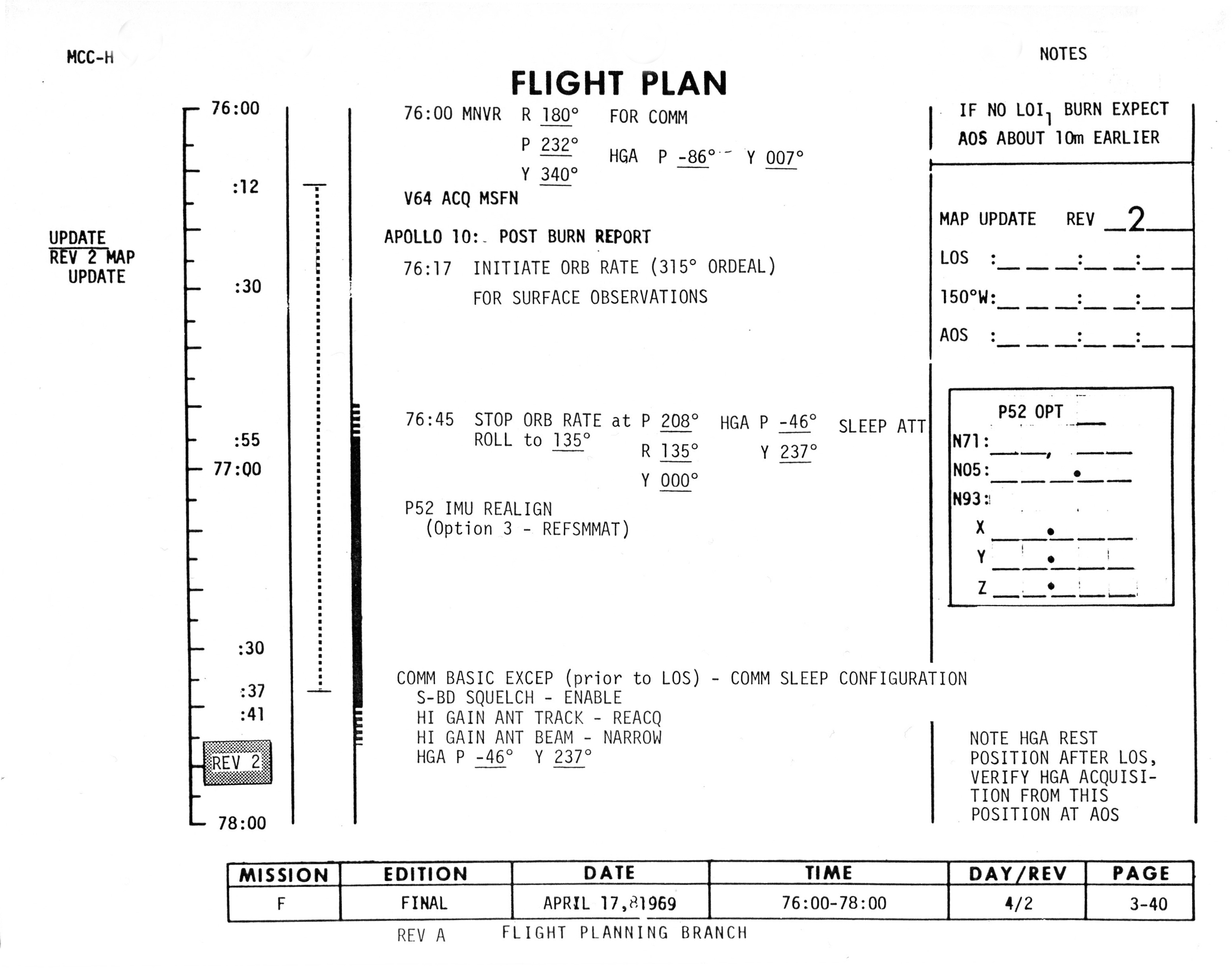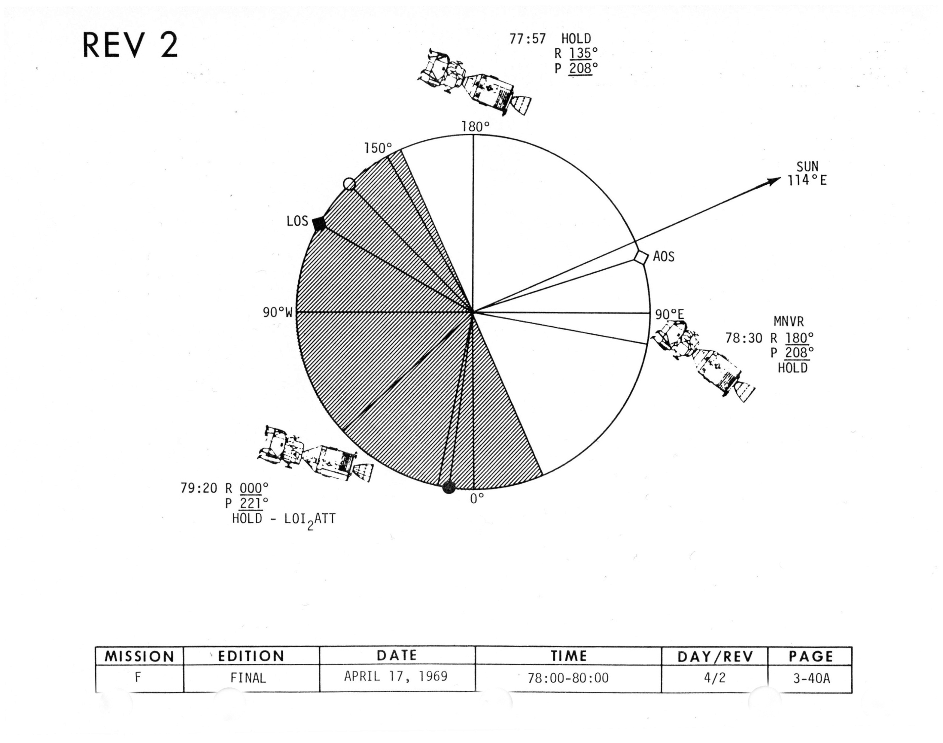 The map update times are given for each revolution and are hand written on the Flight Plan. The times given for Rev 2 are LOS, 77:47:59; sunrise, 77:51:40; crossing 150°W, 77:58:27; AOS, 78:31:19; sunset, 79:13:33.
