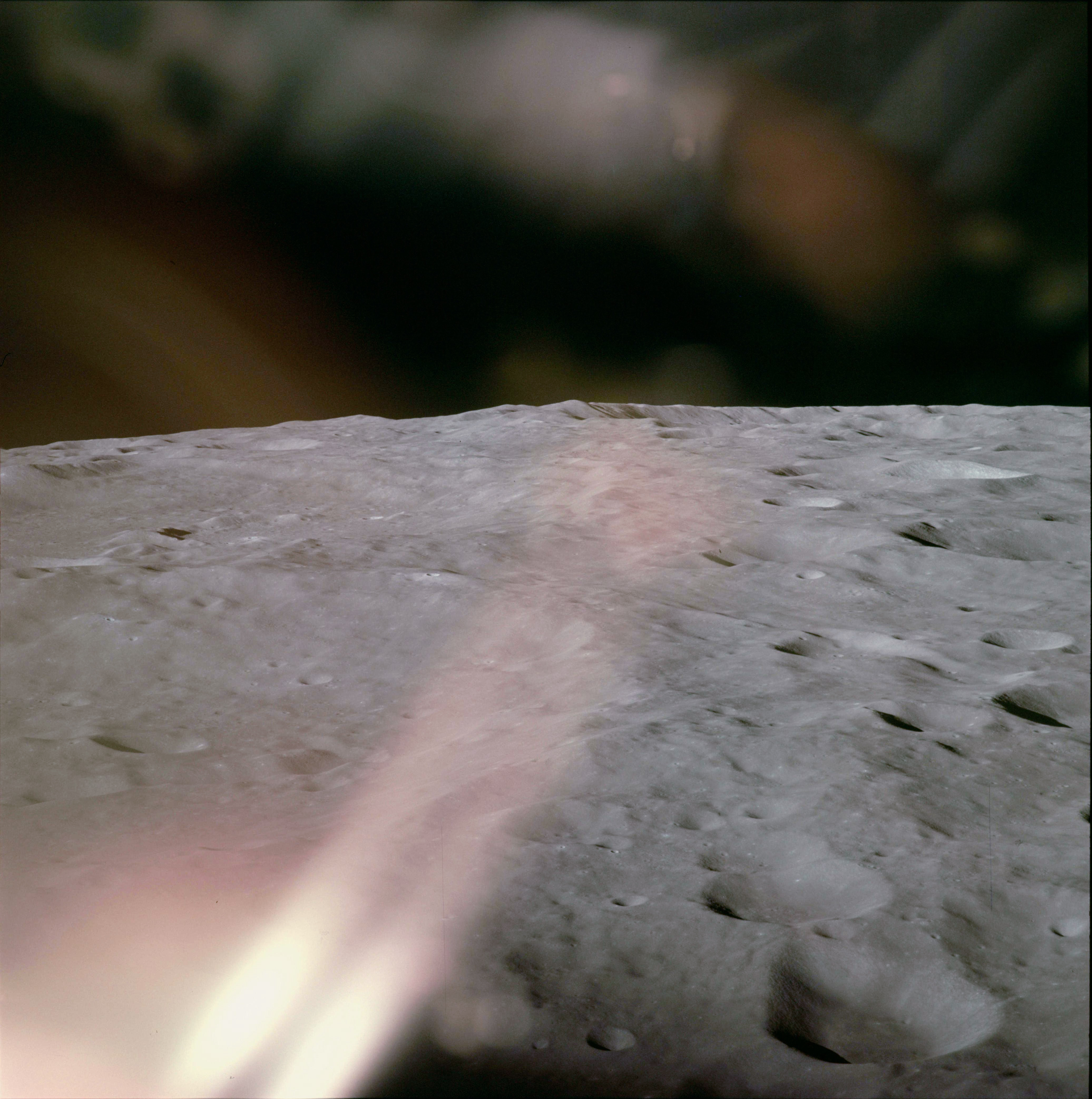 During LOI, the big SPS engine on the aft end of the Service Module is facing the direction of travel which means that the CM windows are facing generally rearwards with the LM in view. As they came towards the point where the burn would occur, they were in the Moon's shadow. The LM's overhead window, on the other hand, is facing forwards and is in Gene's field of view from his right-hand seat. As they neared the Moon's sunset terminator, Gene could see the obliquely-lit landscape reflected in this window.