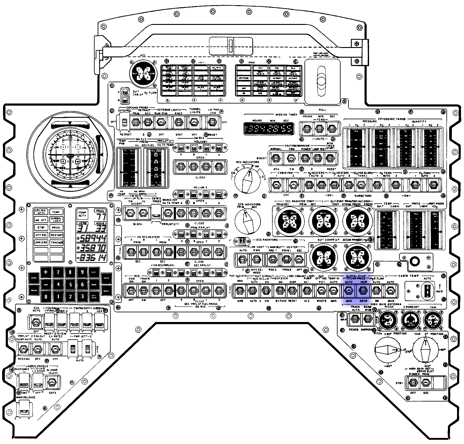 The prime function of Program 40 is to have the computer control the SPS engine throughout a burn. It will start and stop the engine and display the effect of the burn on the DSKY.