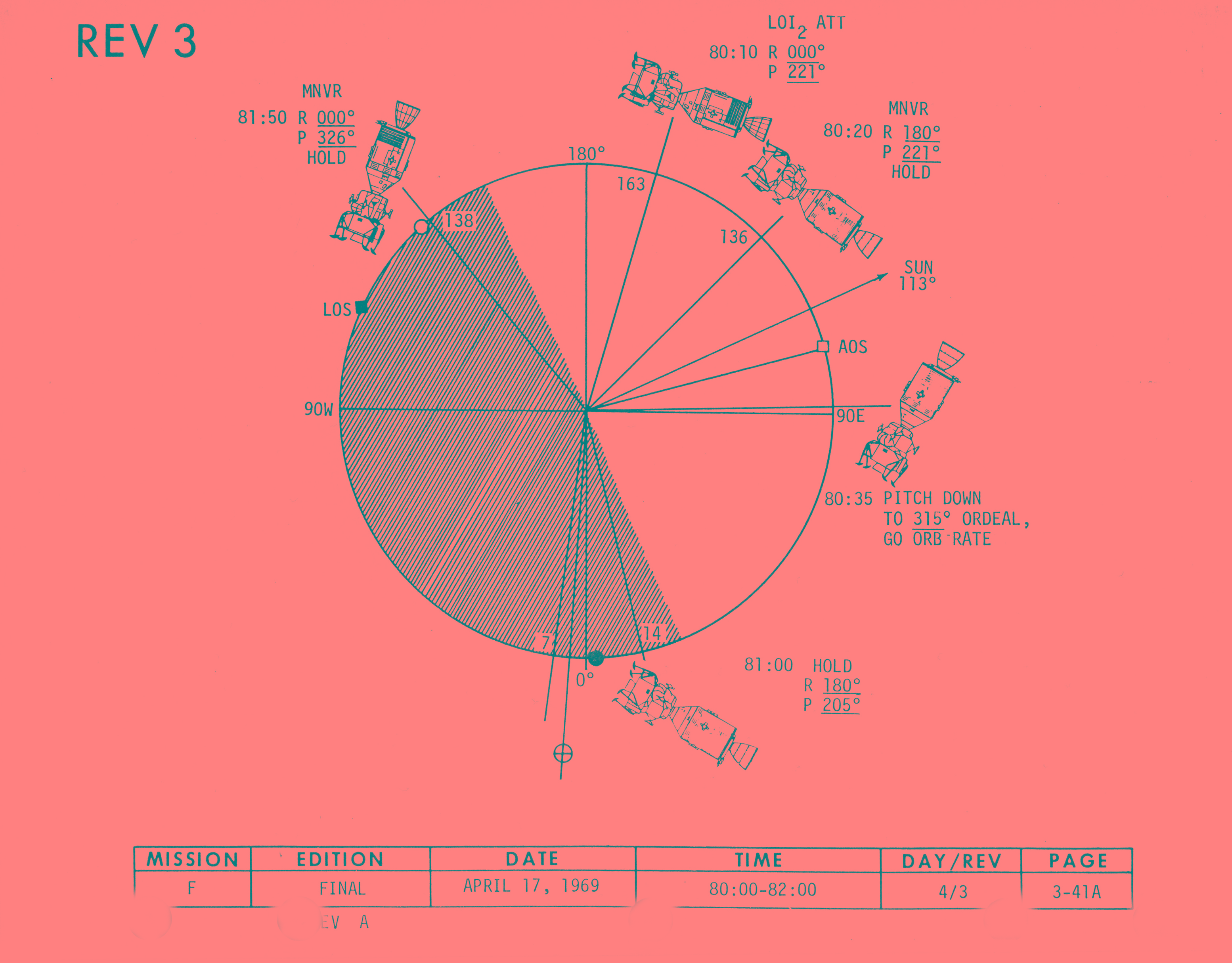 Having successfully entered lunar orbit by performing the LOI-1 manoeuvre, the crew are now beginning their lunar observation activities and preparations for the LOI-2 SPS burn to circularise the orbit of the joint spacecraft. Further TV transmissions are planned as they prepare to enter the Lunar Module Snoopy to transfer some equipment from the Command Module Charlie Brown and make an initial inspection of the LM.