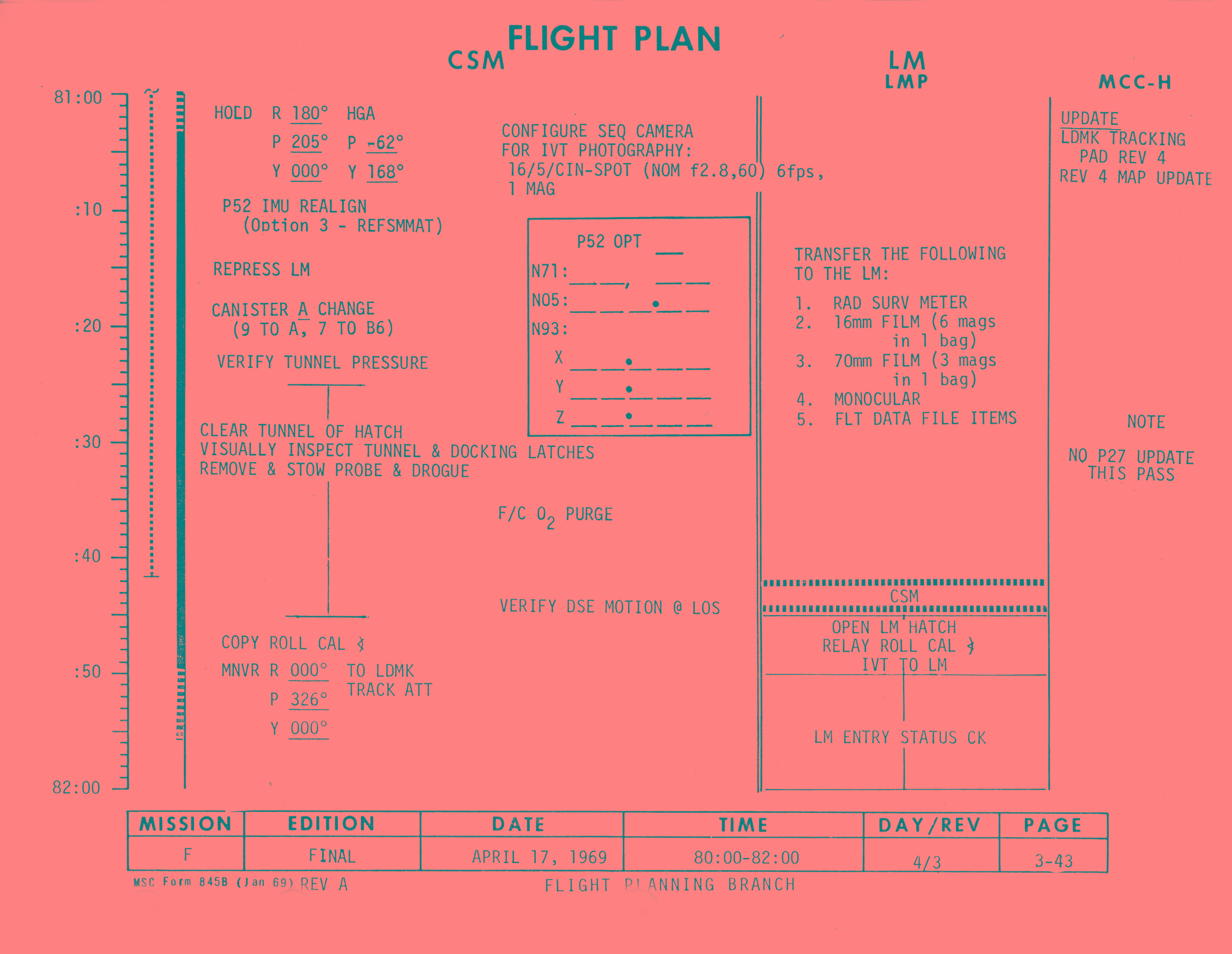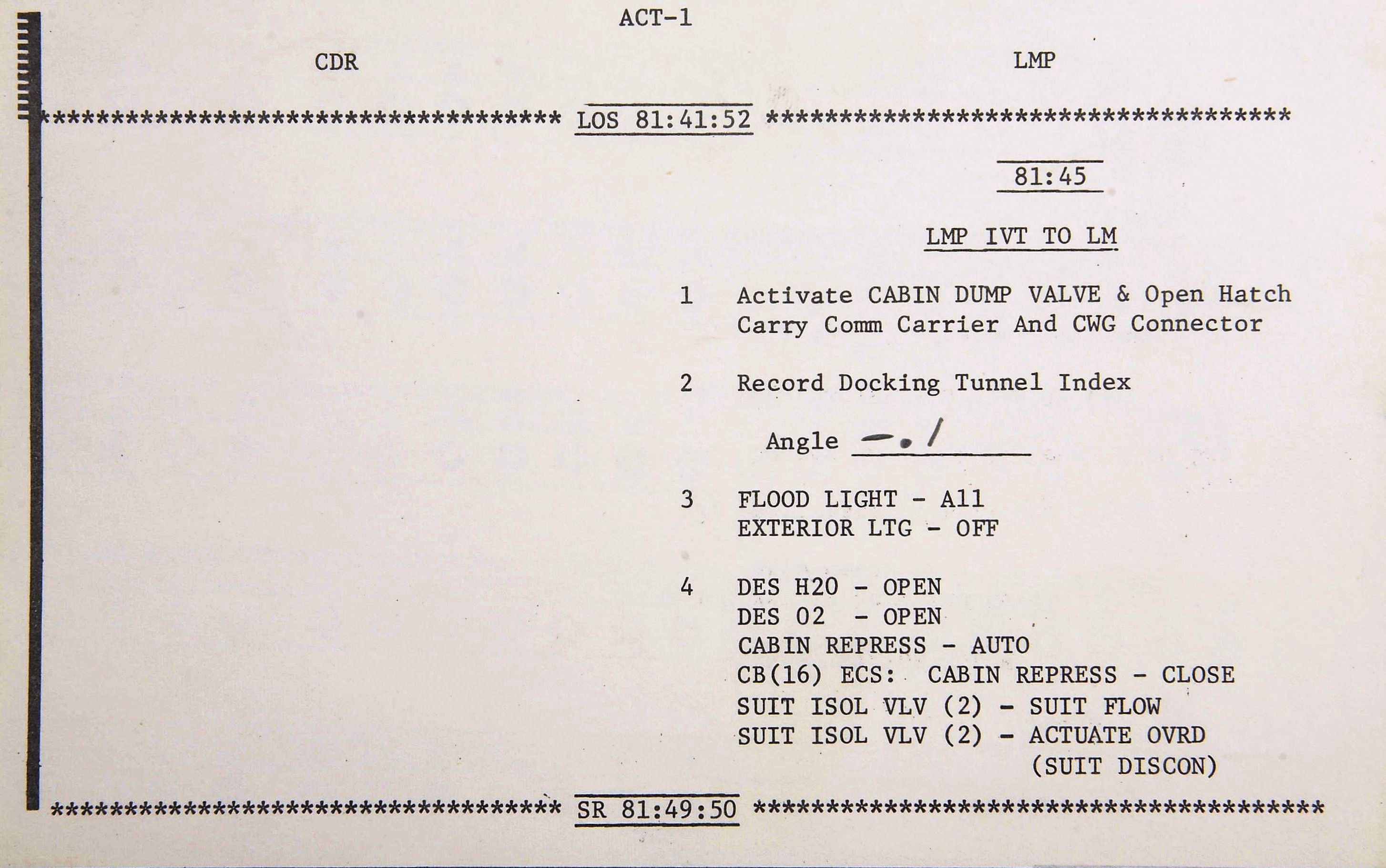 080:10:38 Young (onboard): Okay: 15 minutes to go. We're at the manoeuvre - We haven't done the sextant star check. What's the sextant star check there, babe?