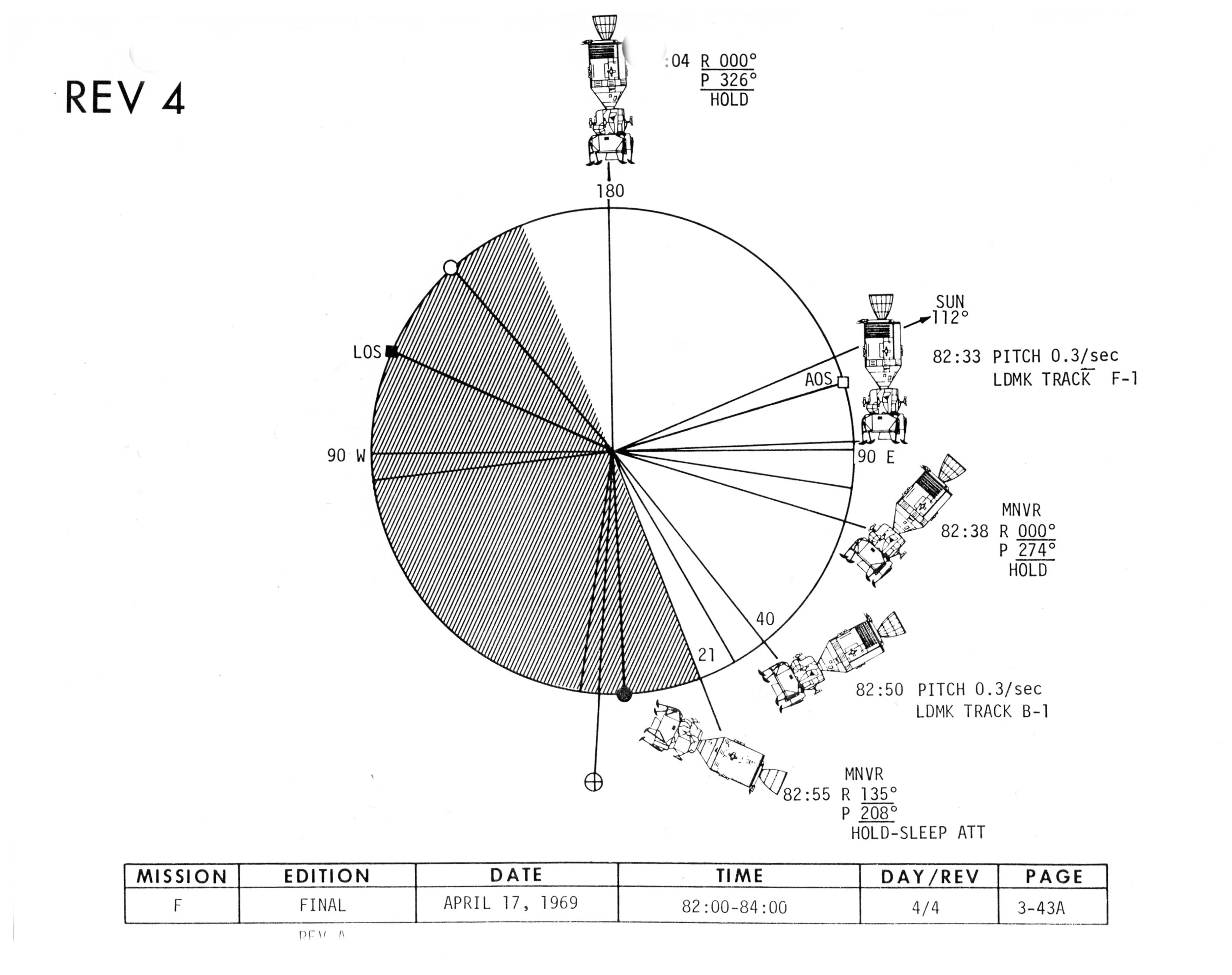 This is Apollo Control at 82 hours, 38 minutes; and we are about 1 minute now from Acquisition of Signal as Apollo 10 moves into the fourth revolution around the Moon. By this time, we would expect that Gene Cernan would be in the Lunar Module beginning some general housekeeping chores and figuring circuit breakers and switch panels for a communications test which will follow later on Rev 4. Also, on this revolution, we'll be doing some landmark tracking. The crew will be taking sights on two landmarks primarily as a practice exercise in the use of the spacecraft's optical system. We're now about 4 seconds from Acquisition Of Signal. We'll stand by for a call to the crew.