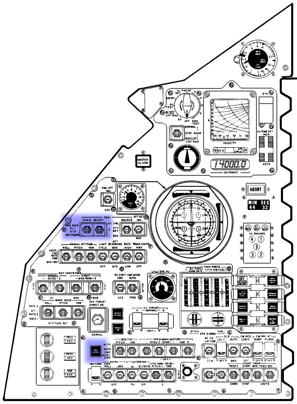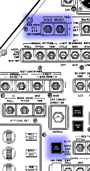 SCS TVCs in Rate Command on panel 1 allows thrust vector control to be switched to SCS control as a backup to the CMC. This both in pitch and yaw.