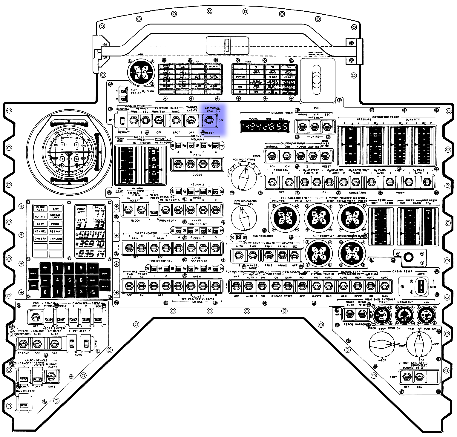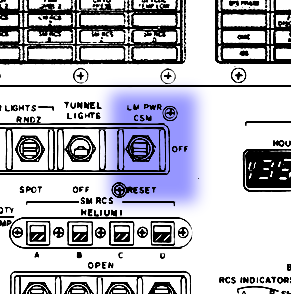 Following the Flight Plan instructions, Stafford has momentarily moved the LM PWR switch on panel 2 from the CSM position to the Reset position and then left it in the Off position. This switch in the CSM position, energizes relays in the LM to connect CSM power to the LM through two umbilicals and disconnects LM power from the LM heater circuits. In the Reset position, the relays in the LM are opened, disconnecting the power supply from the CSM and connecting the LM power supply to the LM heaters. The power supplied from the CSM is for the continuous heaters in the LM, Abort Sensor Assembly (ASA), and cycling heaters in the landing radar, rendezvous radar, S band antenna and inertial measurement unit (IMU).