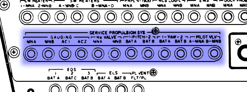 SPS Pitch 1-Bat A & 2-Bat B, Yaw 1-Bat A & 2 Bat B - Applies power from battery bus A or B to the SPS Gimbal Motors Pitch or Yaw 1 or 2 switches on panel 1.