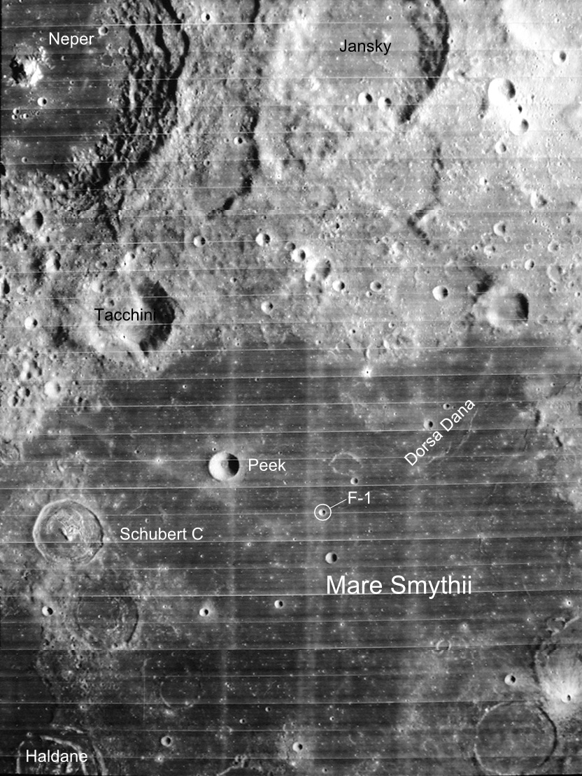 We would expect at this time the crew is involved in taking landmark sightings on a landmark designated F-1 which is in the middle of Smyth's Sea. This is a crater about 5,000 feet in diameter.