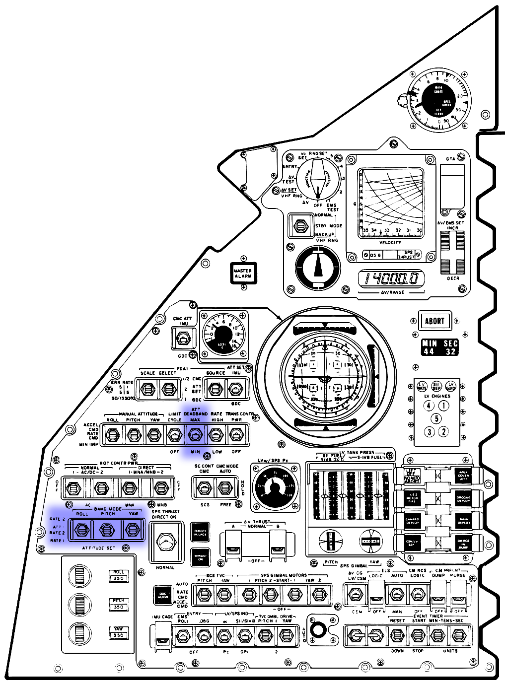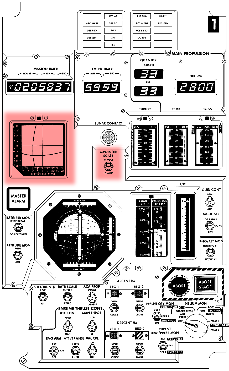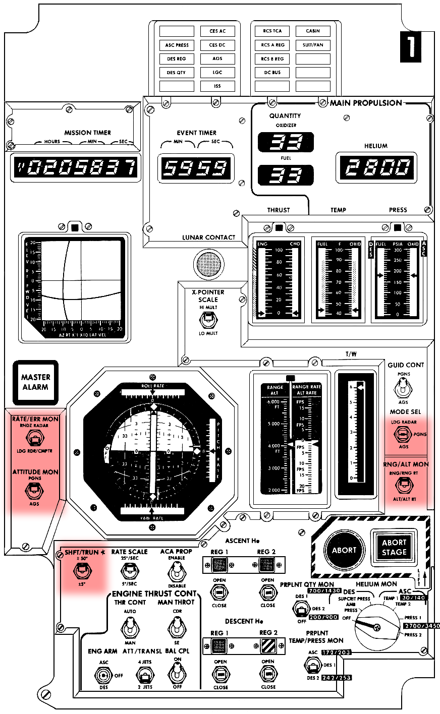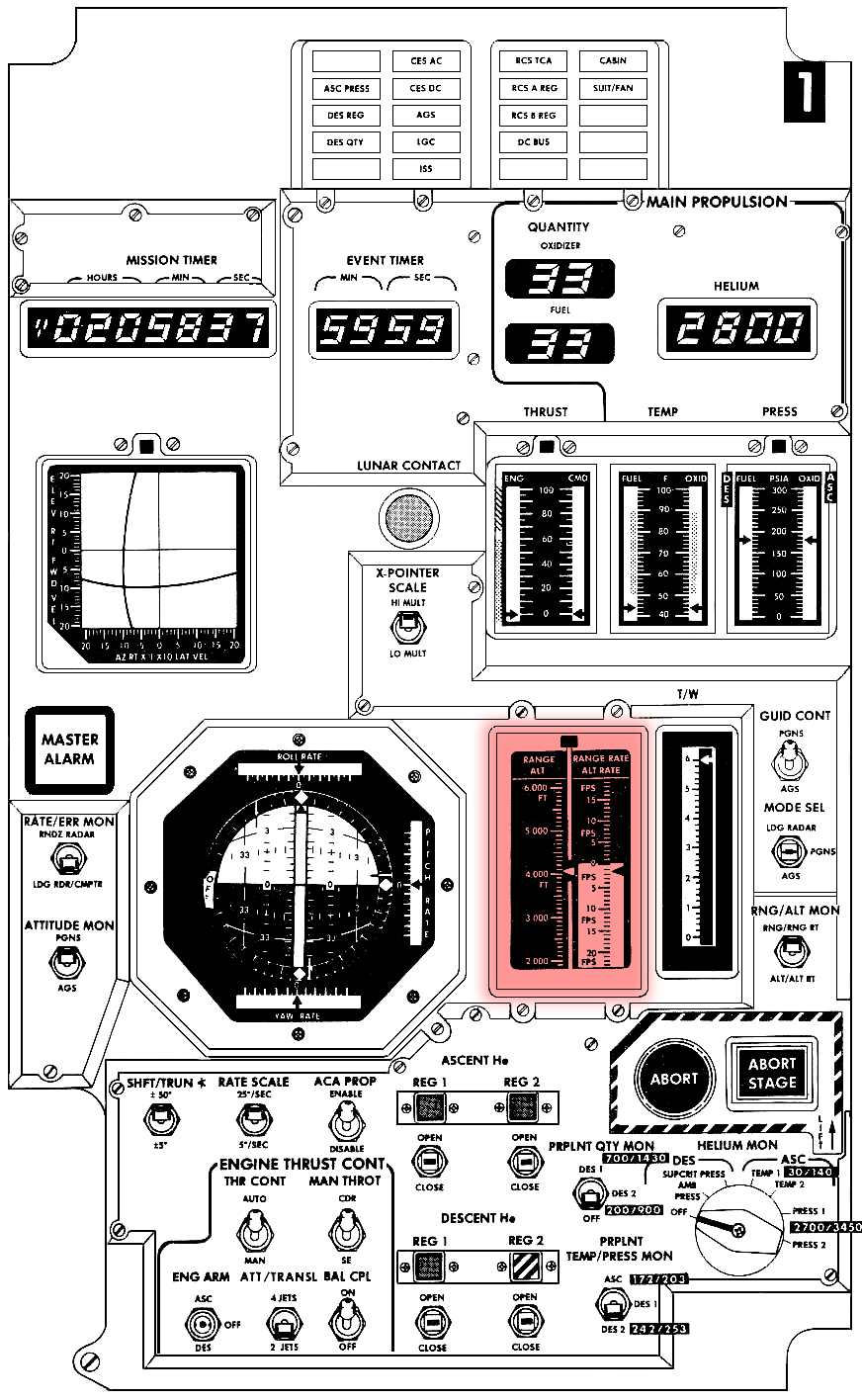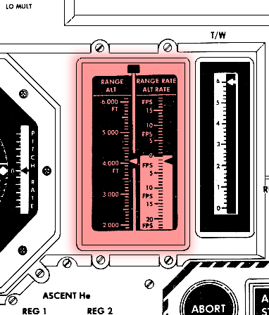 To ensure they have a display of the local vertical attitude on the FDAI, the ORDEAL (Orbital Rate Display Earth And Lunar) is configured to be Orb Rate-Lunar, providing input to the LMP's FDAI on panel 2. The ORDEAL is used after obtaining the LM attitude with respect to the local lunar horizontal from the LGC. The LMP's FDAI will be slewed to display this attitude. The ORDEAL then torques its resolvers at the lunar orbital rate, specified by the altitude set on the Alt Set control for the circular orbit of the body (Earth or Lunar) that is selected. Cernan wants an alternative display of the LM attitude should the AGS not be available.