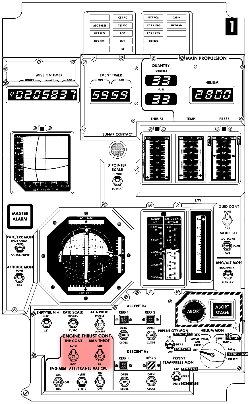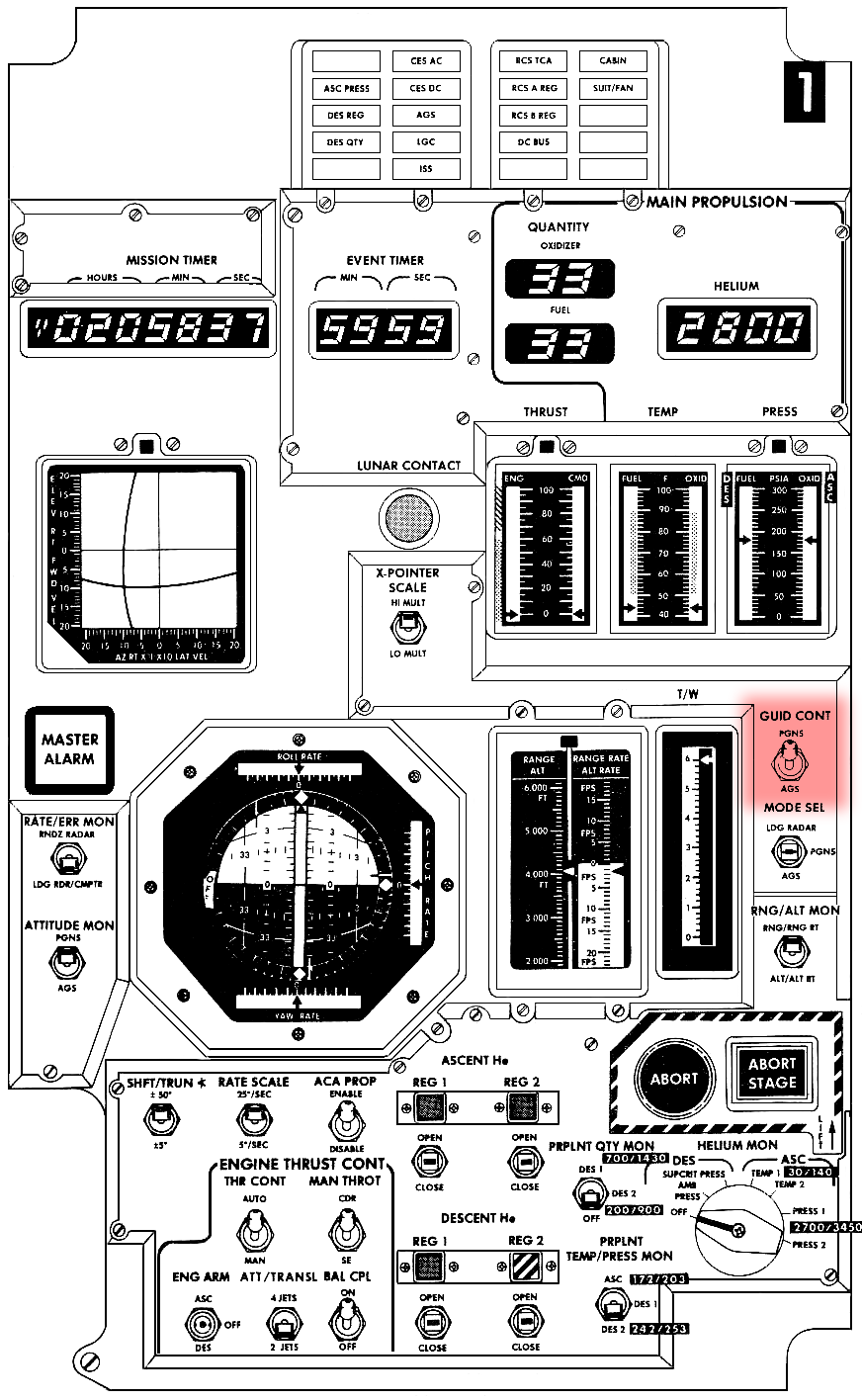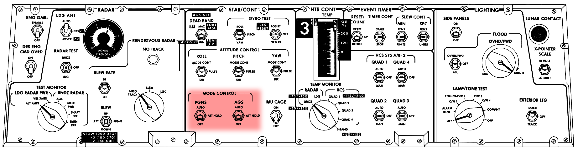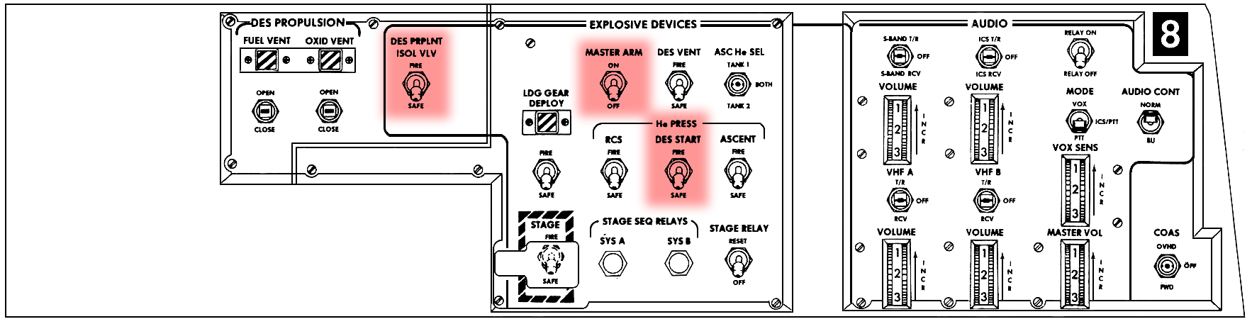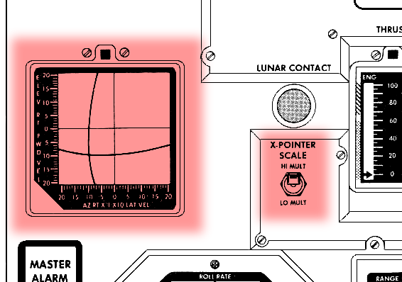 To ensure they have a display of the local vertical attitude on the FDAI, the ORDEAL (Orbital Rate Display Earth And Lunar) is configured to be Orb Rate-Lunar, providing input to the LMP's FDAI on panel 2. The ORDEAL is used after obtaining the LM attitude with respect to the local lunar horizontal from the LGC. The LMP's FDAI will be slewed to display this attitude. The ORDEAL then torques its resolvers at the lunar orbital rate, specified by the altitude set on the Alt Set control for the circular orbit of the body (Earth or Lunar) that is selected. Cernan wants an alternative display of the LM attitude should the AGS not be available.