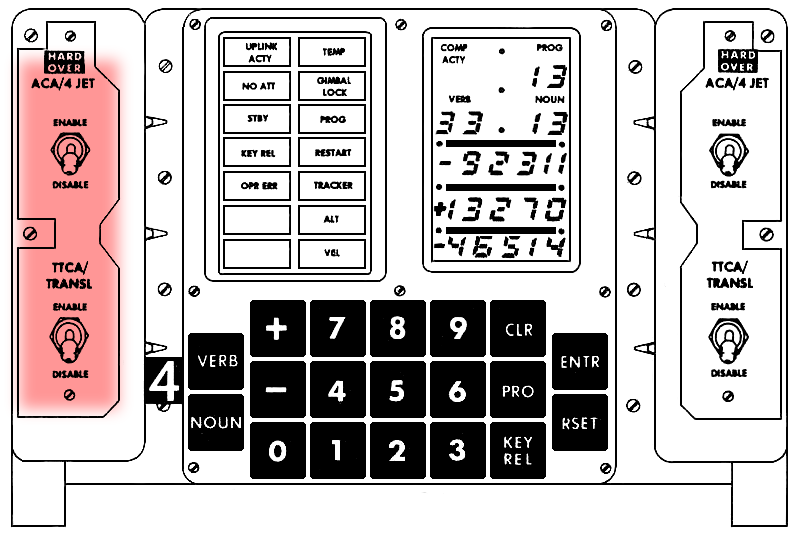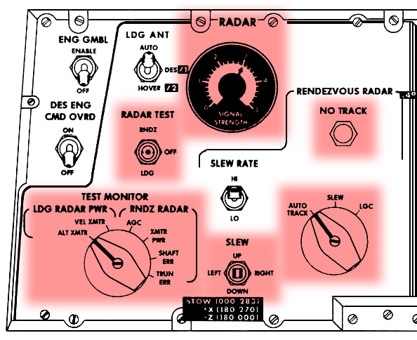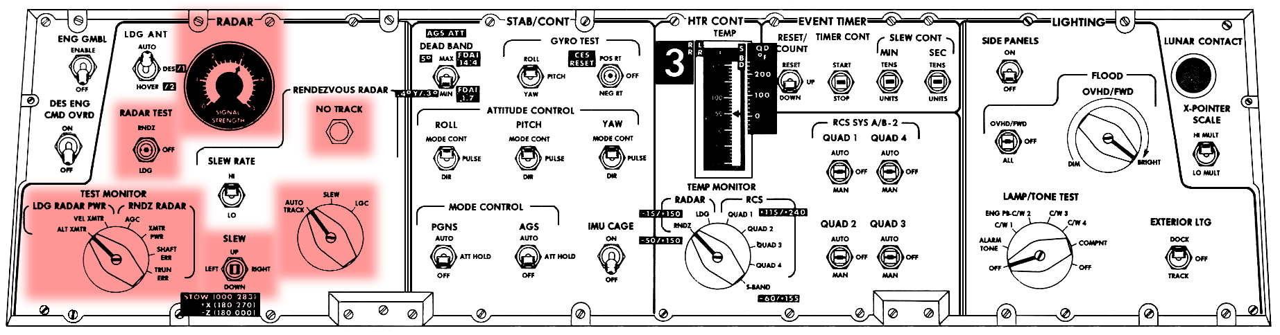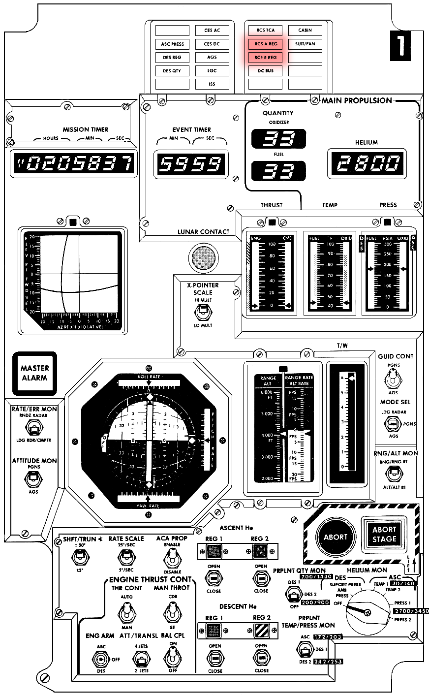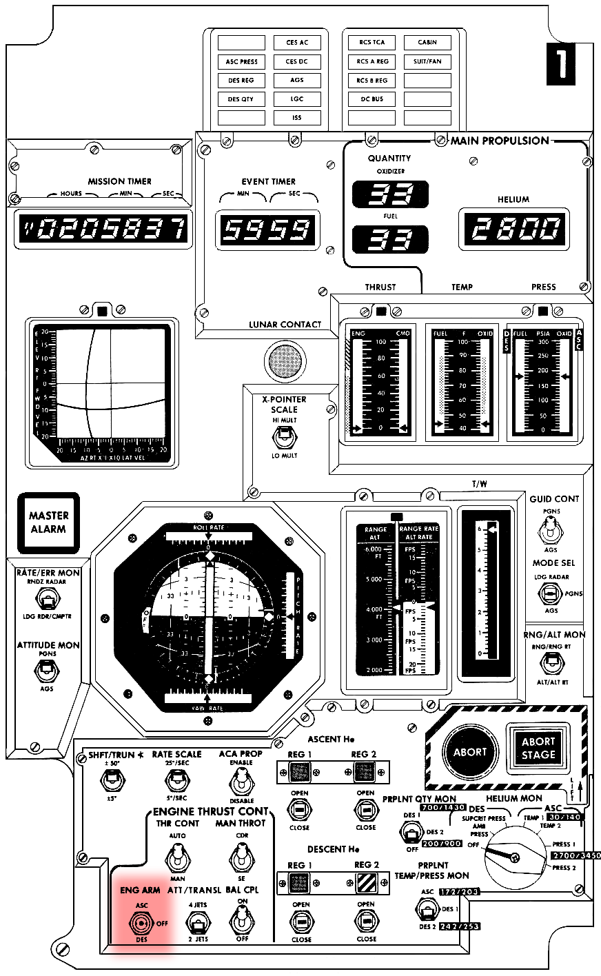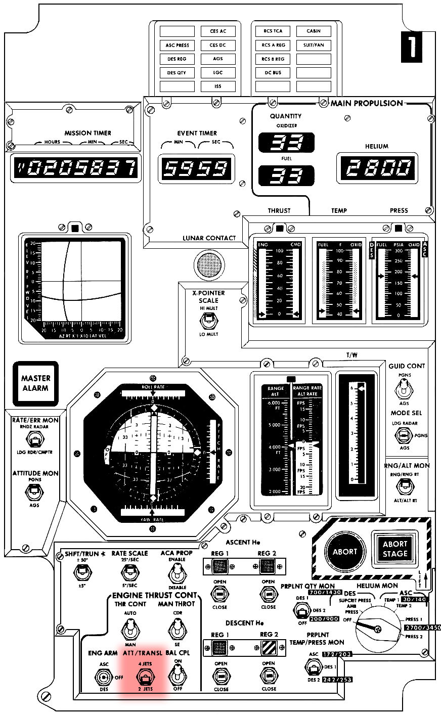 To ensure they have a display of the local vertical attitude on the FDAI, the ORDEAL (Orbital Rate Display Earth And Lunar) is configured to be Orb Rate-Lunar, providing input to the LMP's FDAI on panel 2. The ORDEAL is used after obtaining the LM attitude with respect to the local lunar horizontal from the LGC. The LMP's FDAI will be slewed to display this attitude. The ORDEAL then torques its resolvers at the lunar orbital rate, specified by the altitude set on the Alt Set control for the circular orbit of the body (Earth or Lunar) that is selected. Cernan wants an alternative display of the LM attitude should the AGS not be available.