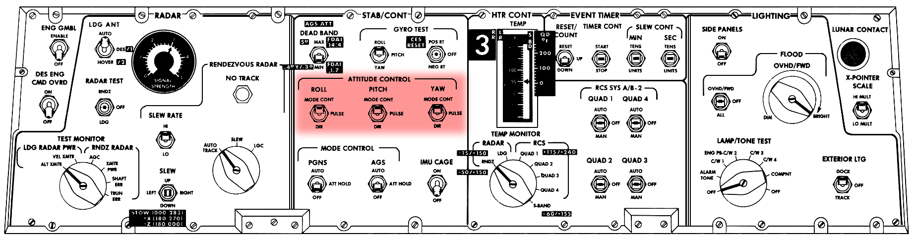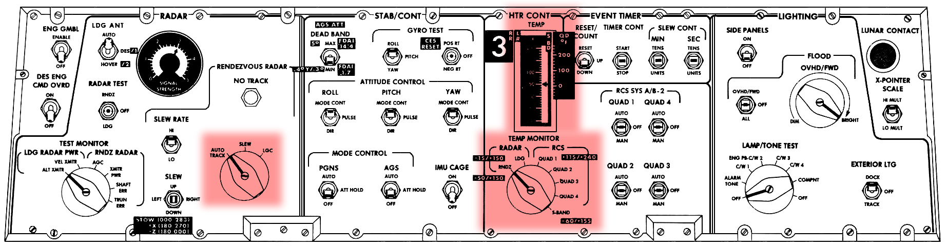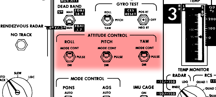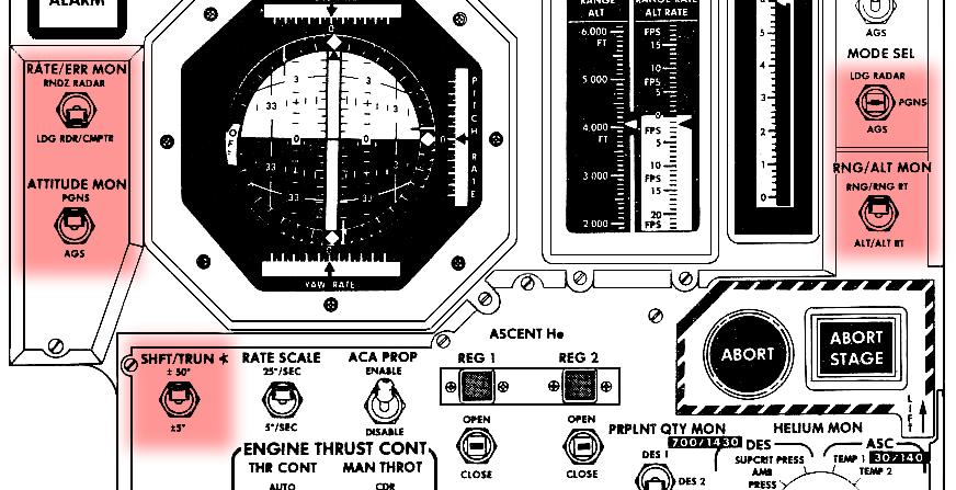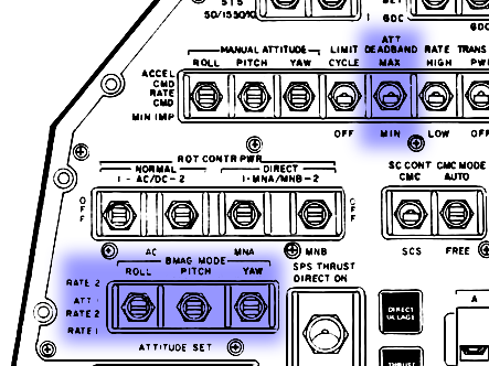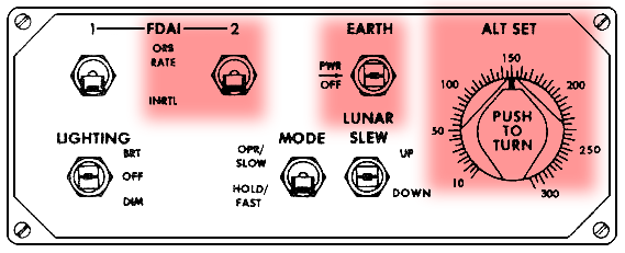 FDAI select switch, body select switch and Alt Set rotary selector - LM Ordeal panel.