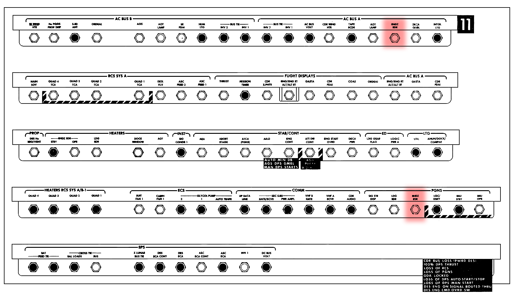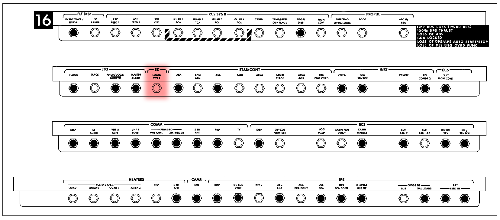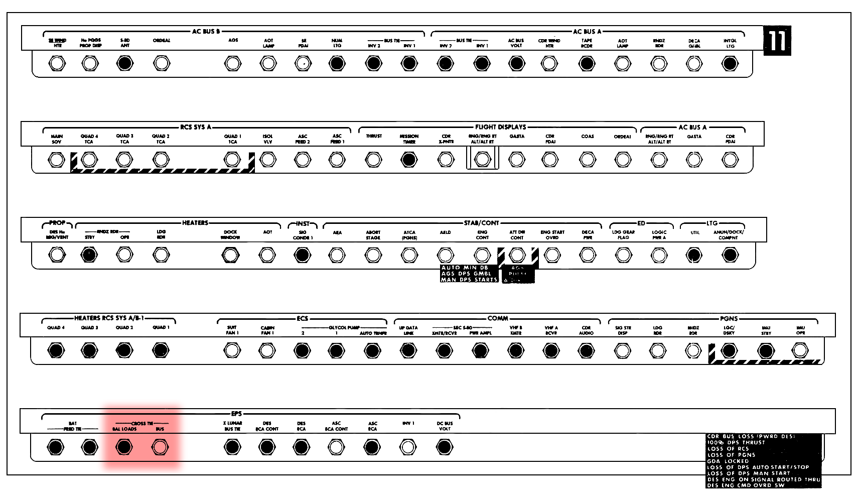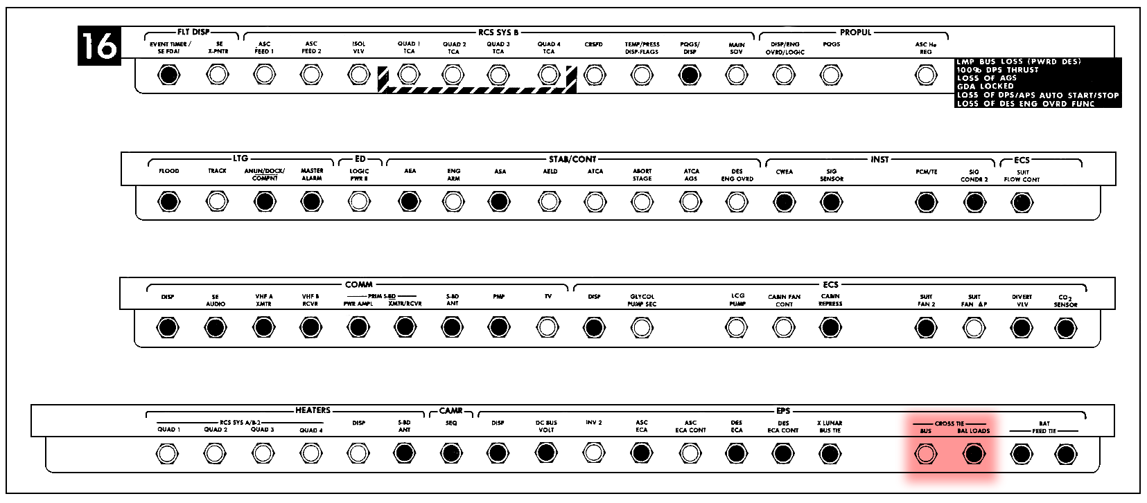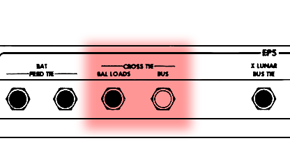 The EPS Cross Tie-Bal Loads circuit breaker on panel 11 for the CDR and panel 16 for the LMP, tie each feeder bus system to the opposite dc bus through its EPS Crosstie-Bal Loads circuit breaker. By doing so it provided a redundant path for IS subsystem sensors and EPS display circuit breakers up to a load of 30 amps.
