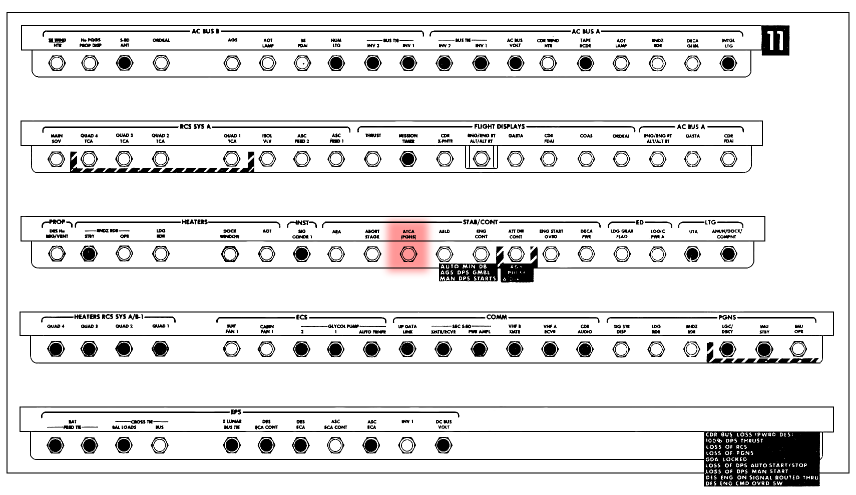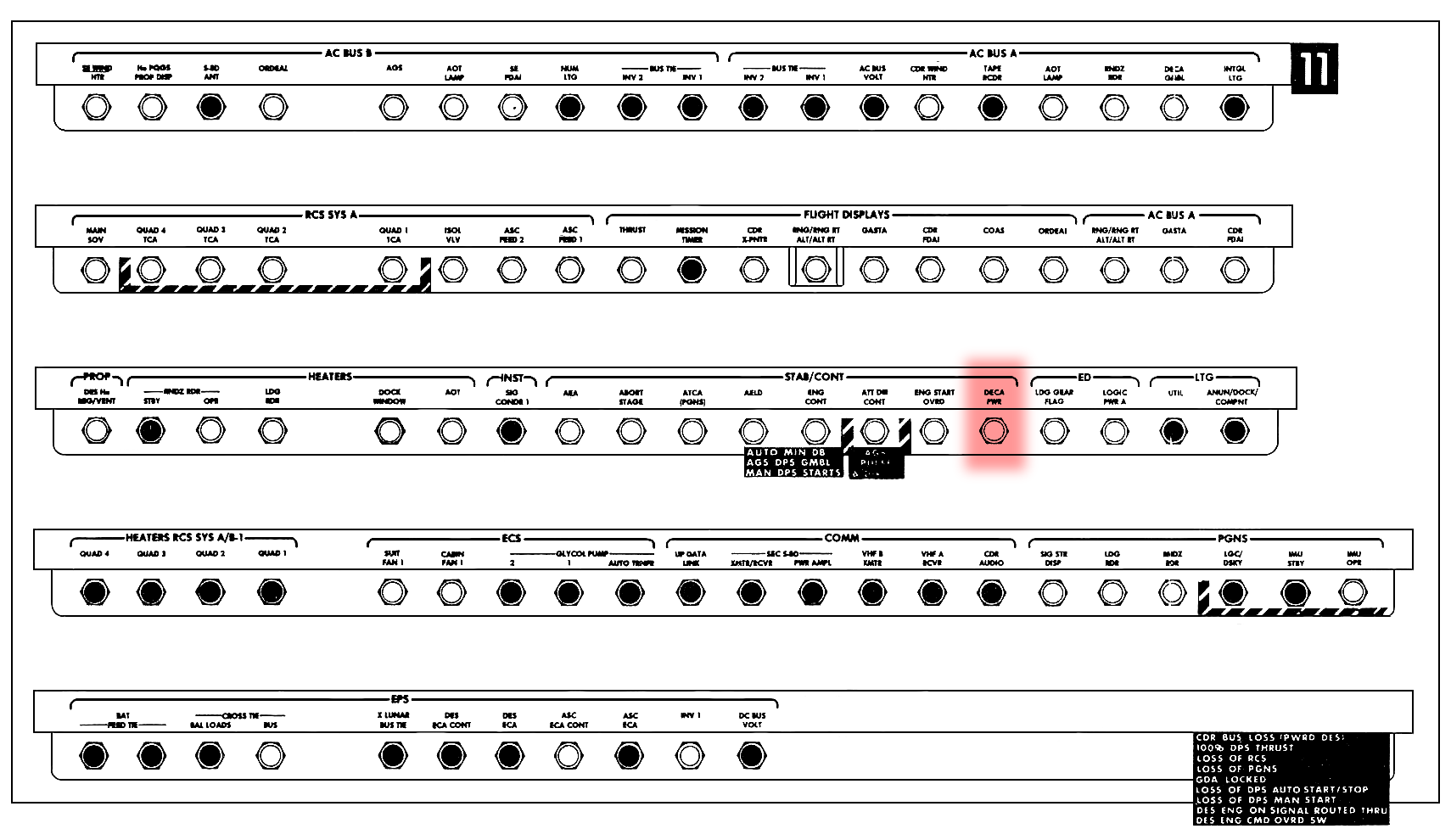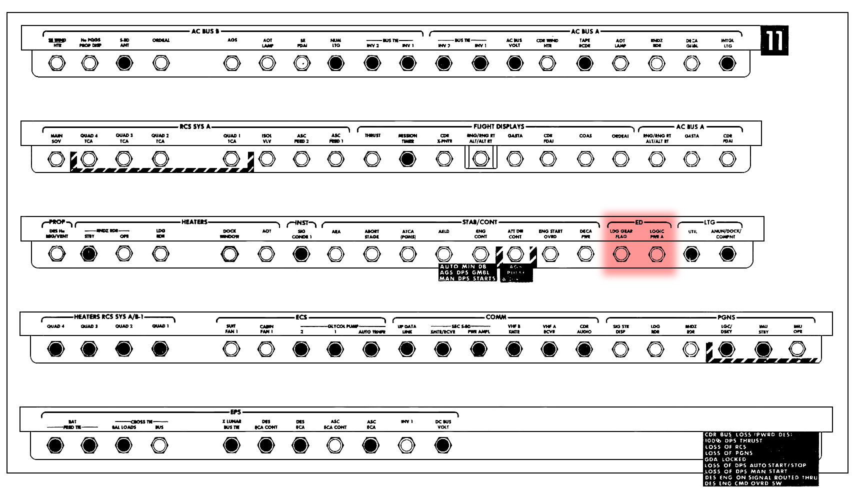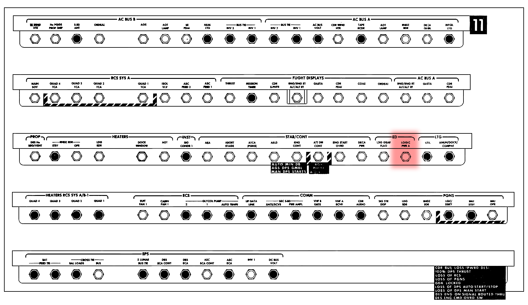 The EPS Cross Tie-Bal Loads circuit breaker on panel 11 for the CDR and panel 16 for the LMP, tie each feeder bus system to the opposite dc bus through its EPS Crosstie-Bal Loads circuit breaker. By doing so it provided a redundant path for IS subsystem sensors and EPS display circuit breakers up to a load of 30 amps.