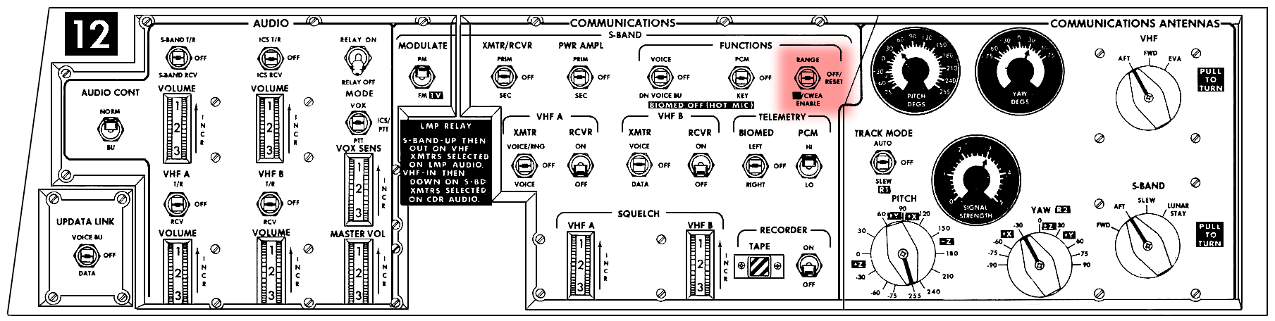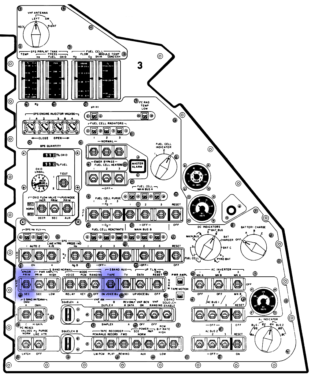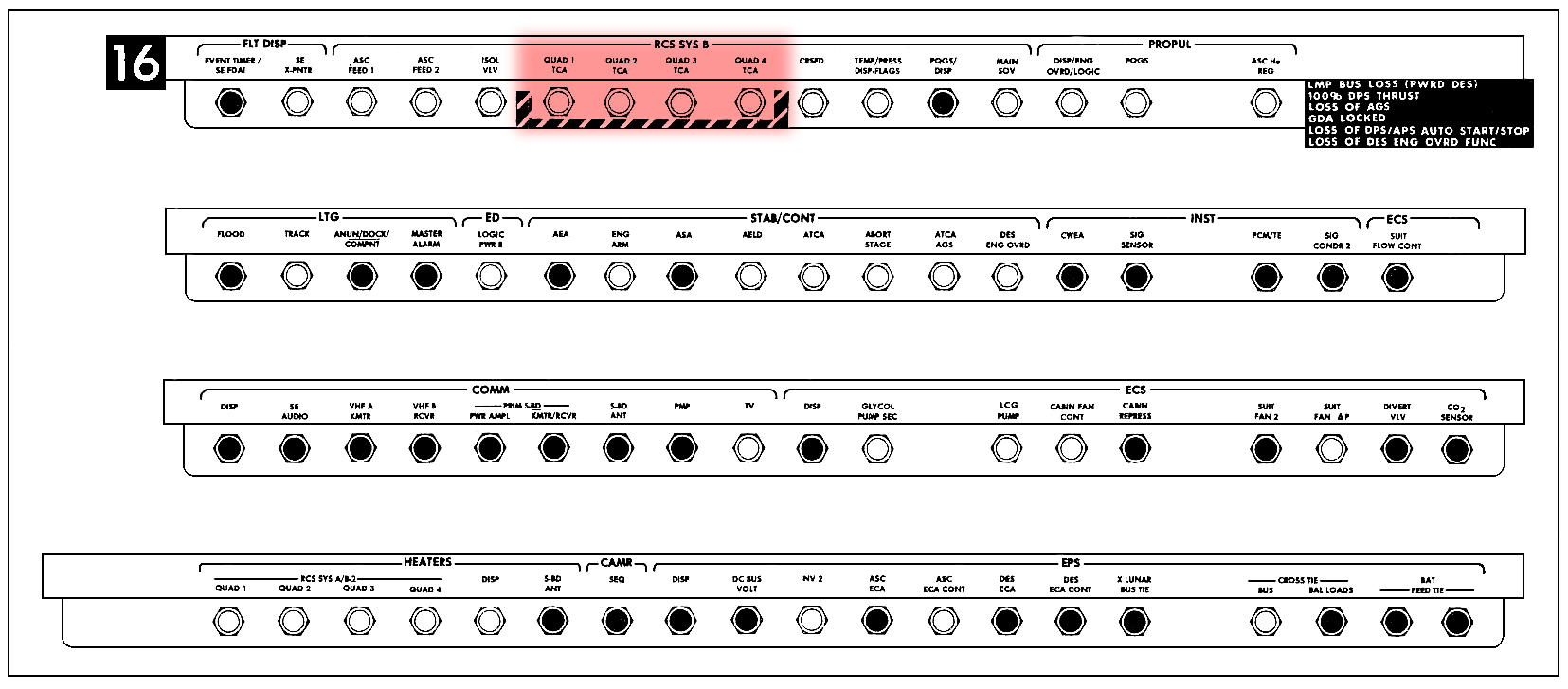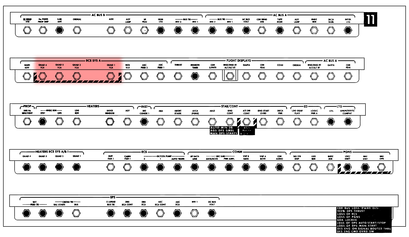 The EPS Cross Tie-Bal Loads circuit breaker on panel 11 for the CDR and panel 16 for the LMP, tie each feeder bus system to the opposite dc bus through its EPS Crosstie-Bal Loads circuit breaker. By doing so it provided a redundant path for IS subsystem sensors and EPS display circuit breakers up to a load of 30 amps.