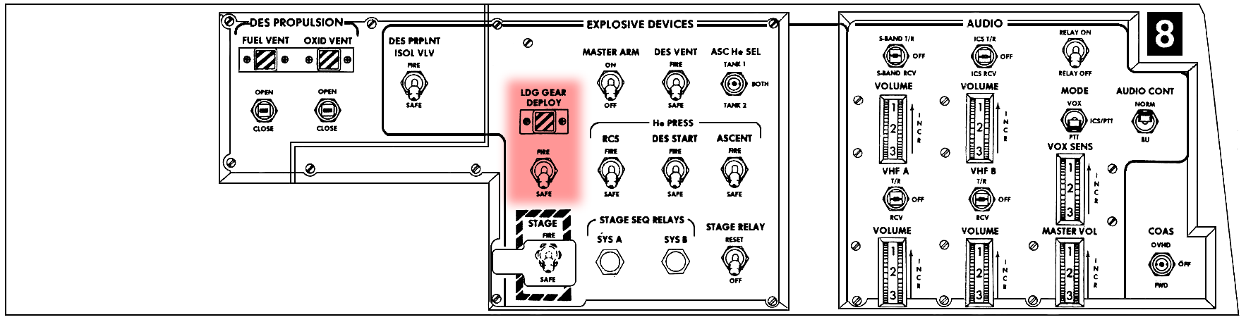 The LDG Gear Deploy switch on panel 8 is placed in the Fire position. This actuates explosive devices that release the stowed landing gear. The Ldg Gear Deploy talkback indicator changes to Gray once indication is received from all four landing gear assemblies, confirming the full deployment.