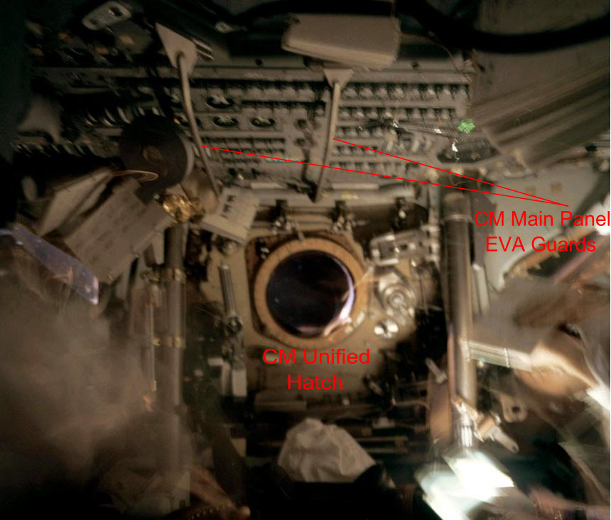 With the CM tunnel vent valve in the LM Press position, the CM cabin atmosphere is vented into LM tunnel and with the LM overhead hatch vent valve open, pressurizes the LM cabin. This is used primarily as a procedure for pressurising the LM soon after departure from Earth or as a backup. Young is selecting this position in an attempt to clear any of the Mylar hatch insulation which may be blocking the valve.
