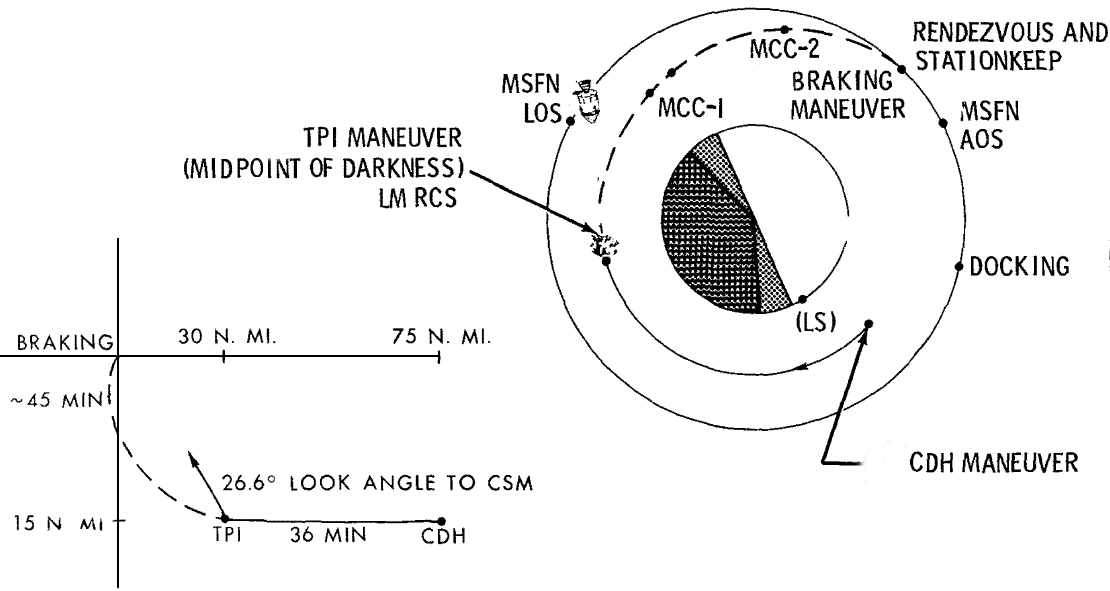 Following the TPI manoeuvre, the LM starts to climb up to the CSM orbital altitude. There are two opportunities to make mid-course corrections if required, before arriving at the final braking phase. Three braking manoeuvres were planned, carried out by the LM. The LM at this stage was very light and extremely responsive to firings of its RCS. The CSM could backup these manoeuvres if required, but was still considerably heavier and less responsive.