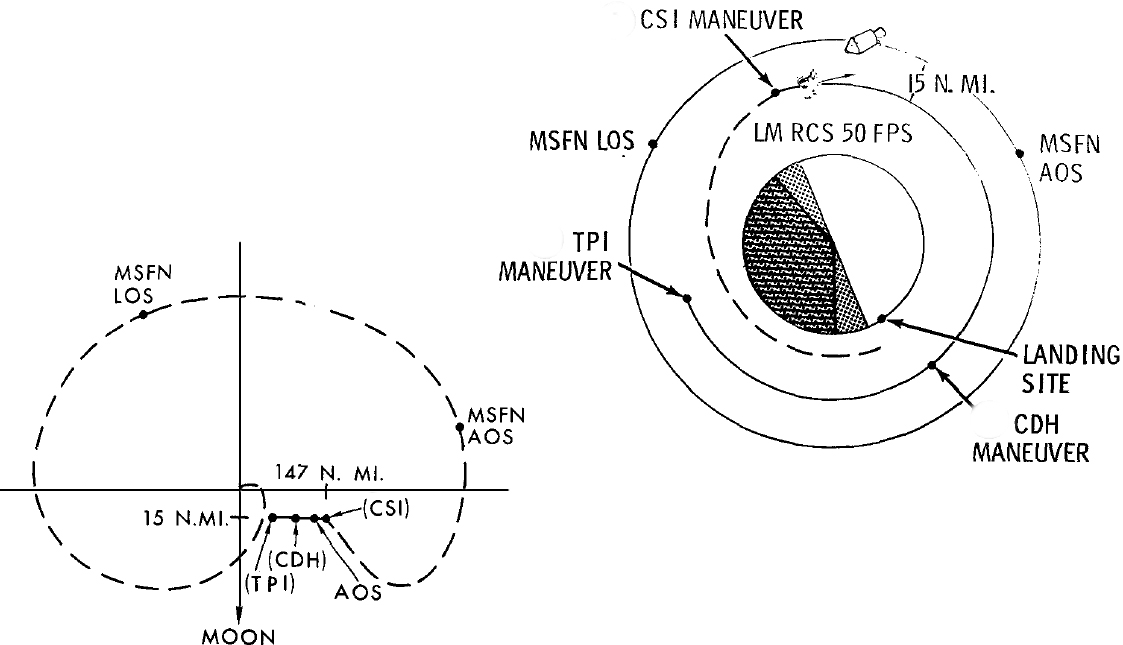 At the time of the first LM apolune following the insertion burn, the CSI manoeuvre effectively circularized the LM orbit. Half an orbit after CSI, the CDH manoeuvre placed the LM in an orbit that was constantly 15 miles (27.8 km) below that of the CSM. This gave the LM time to track the CSM using the rendezvous radar and calculate the parameters for the TPI manoeuvre.