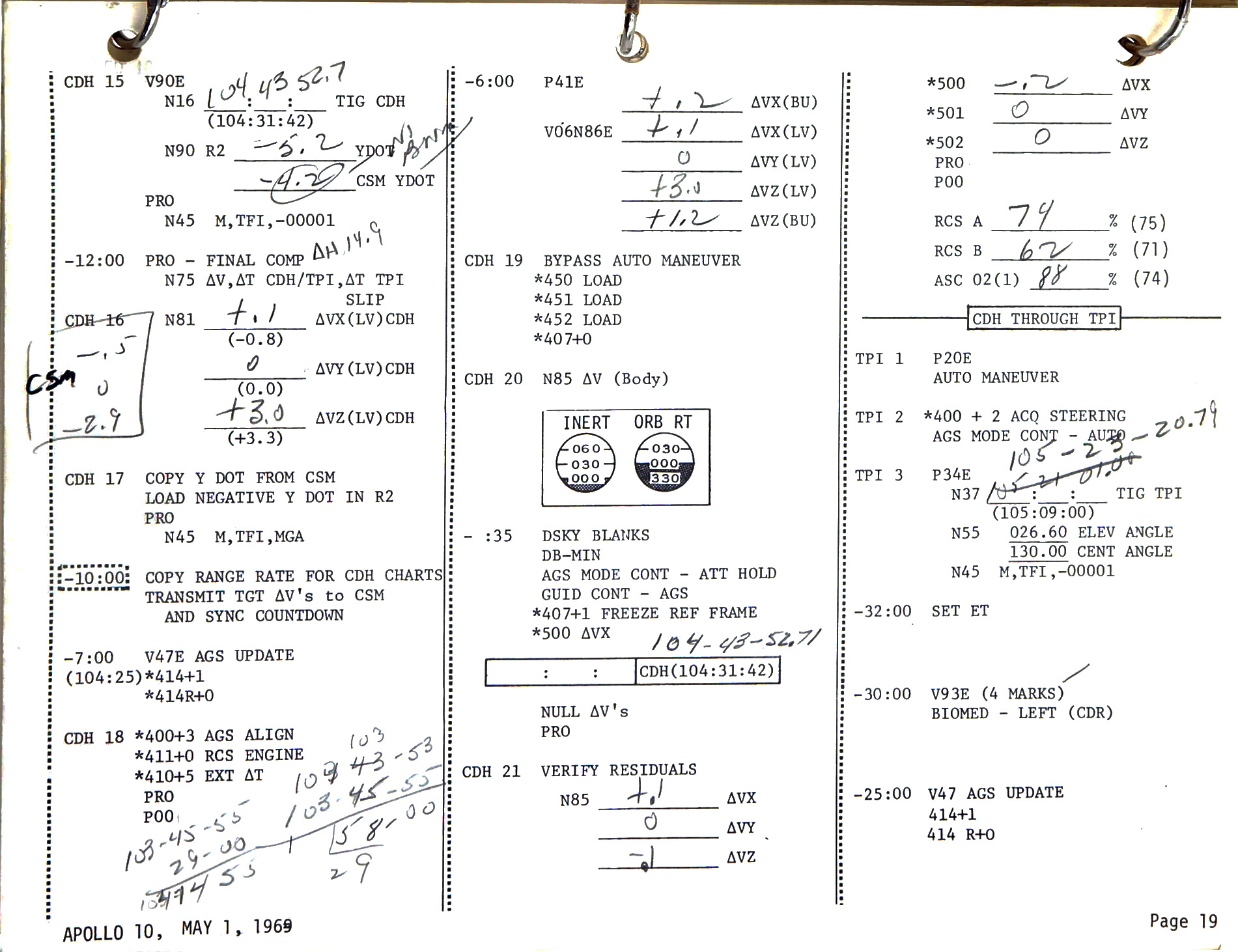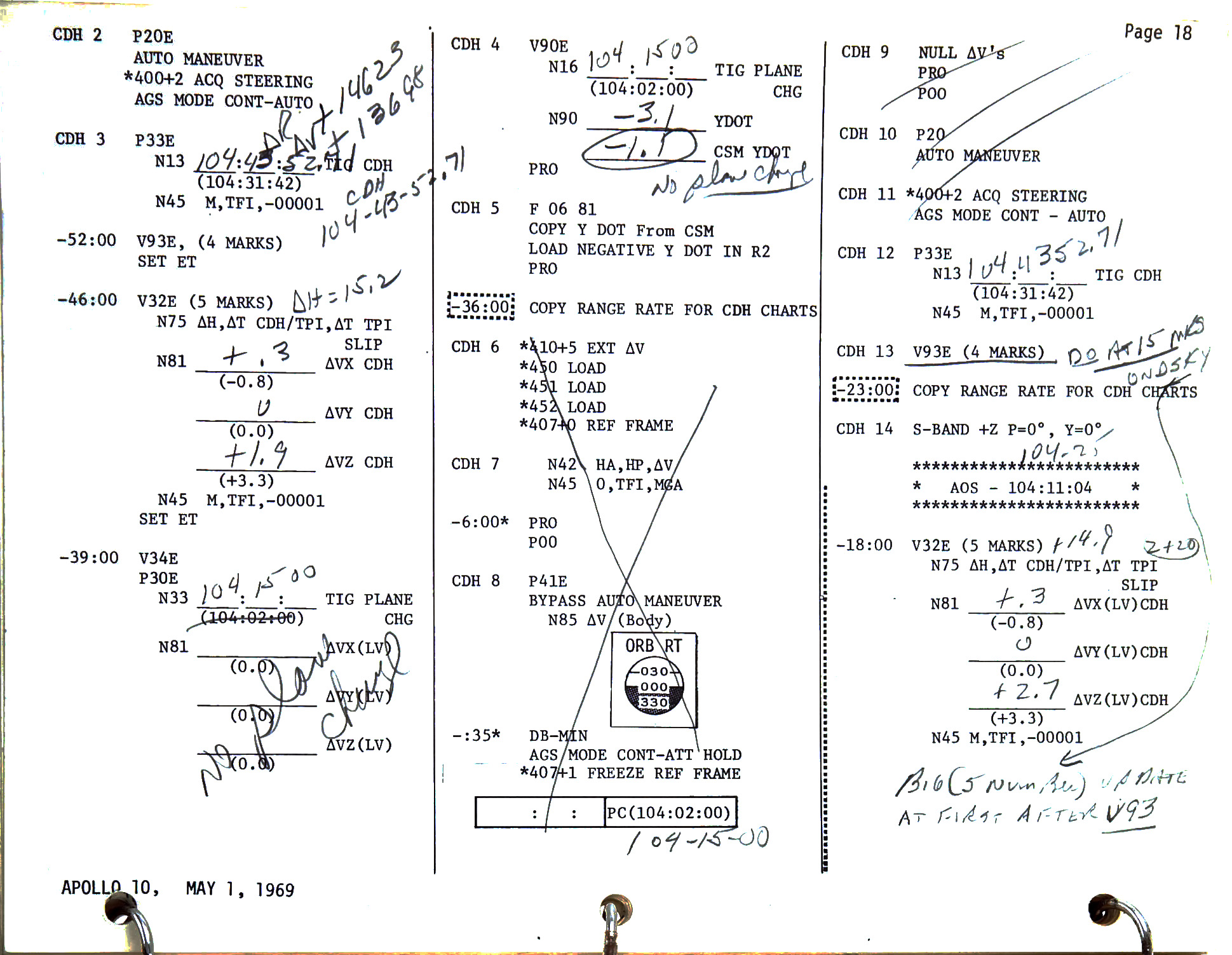 Page 18 of the LM Timeline Book shows details of the procedures the crew followed between CSI and CDH. The steps to be taken for the cancelled plane change are included. It includes the notations made by the crew at the time. AGS related entries begin with the * symbol.