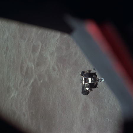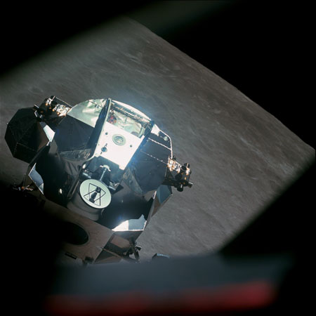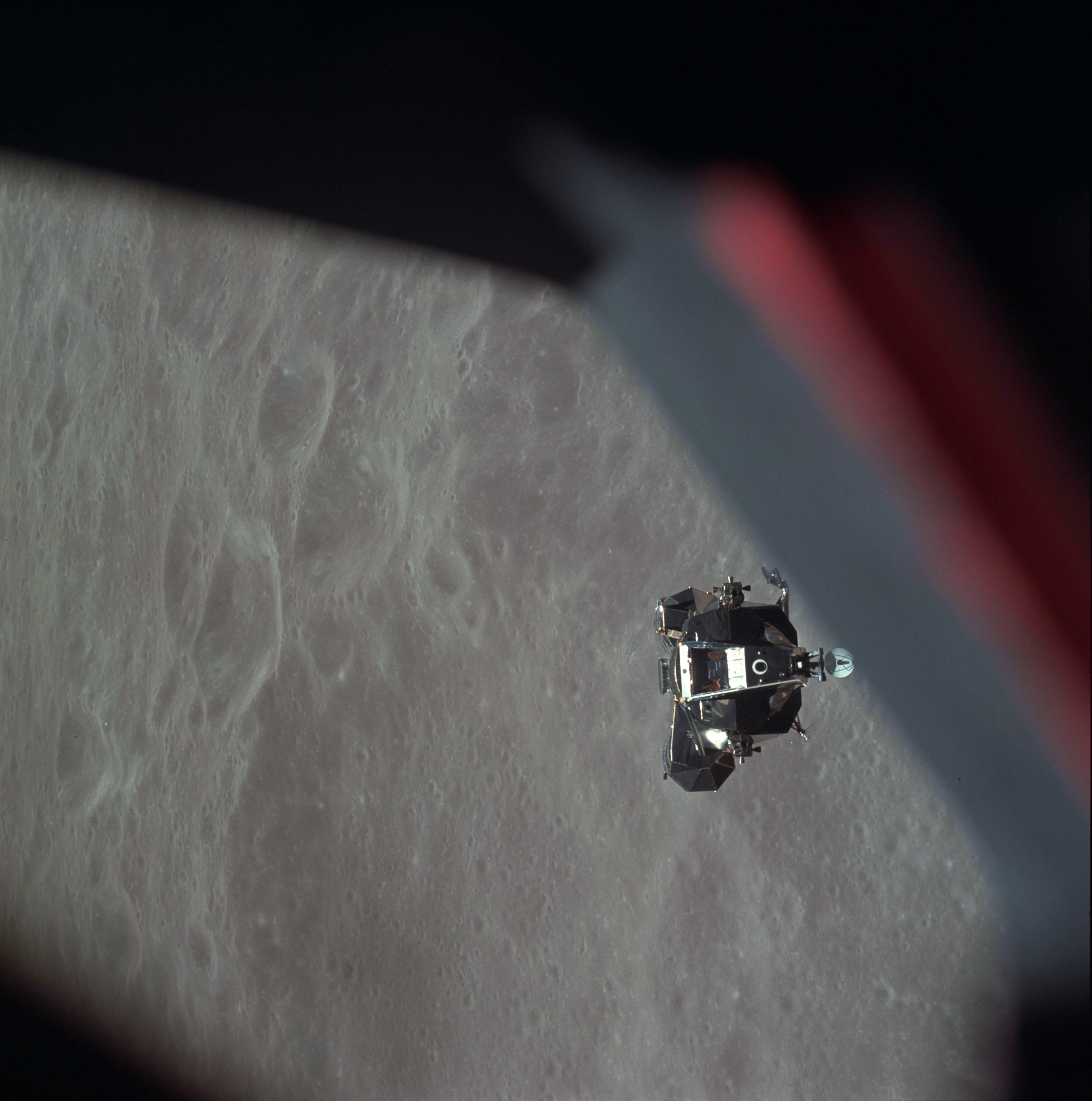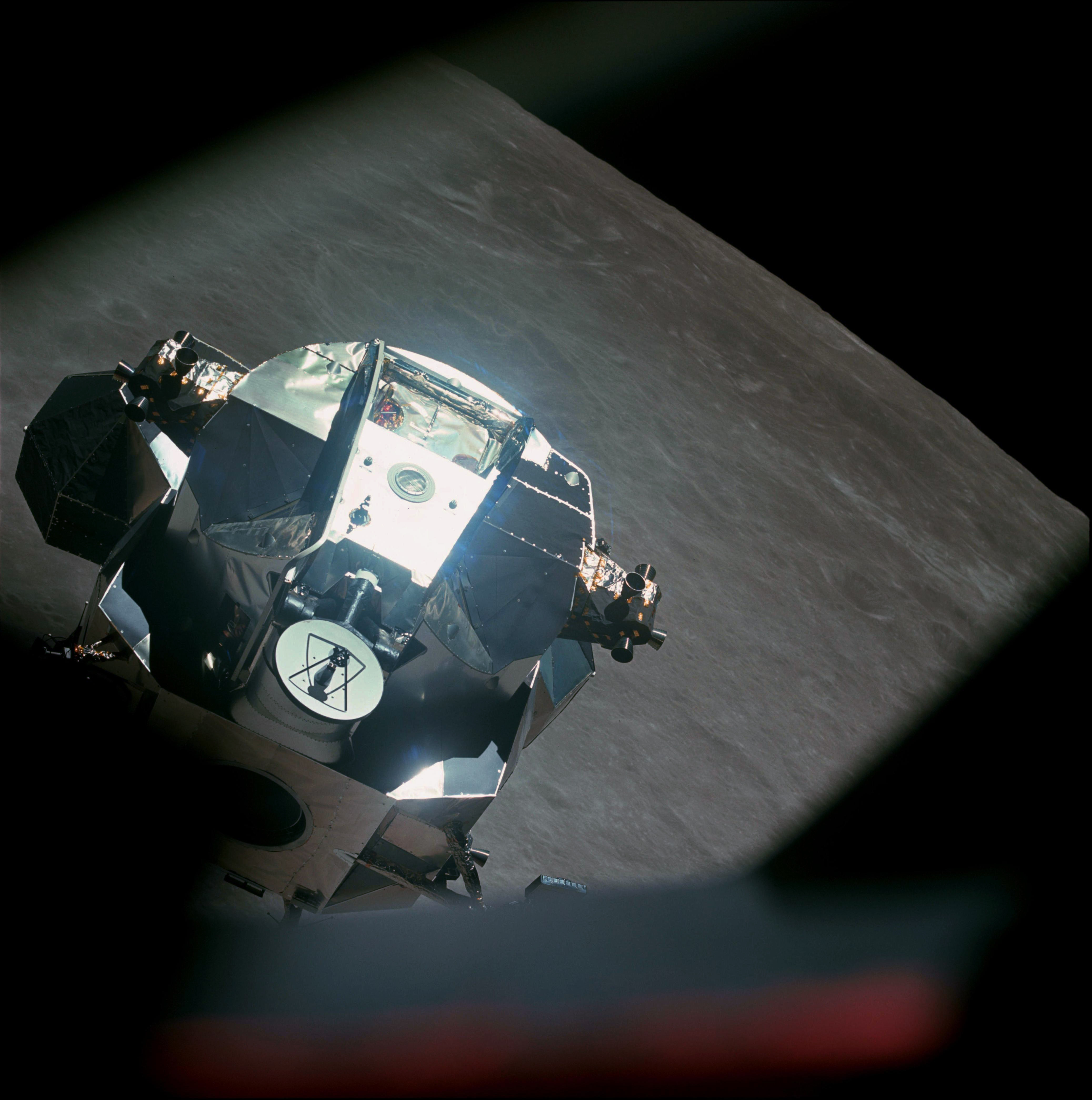 AS10-34-5117 - LM Snoopy ascent stage pitching down to present the docking drogue to the CSM - Image by NASA/Johnson Space Center.
