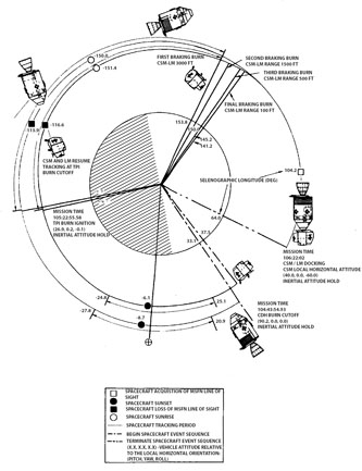 The braking was completed at 106:05:49 with a combined Delta-V of X, +18.5; Y, -2.6; Z, +25.5; total, +36.6 (all fps: X, +5.6; Y, -0.8; Z, +7.8; total, +11.2 m/s)