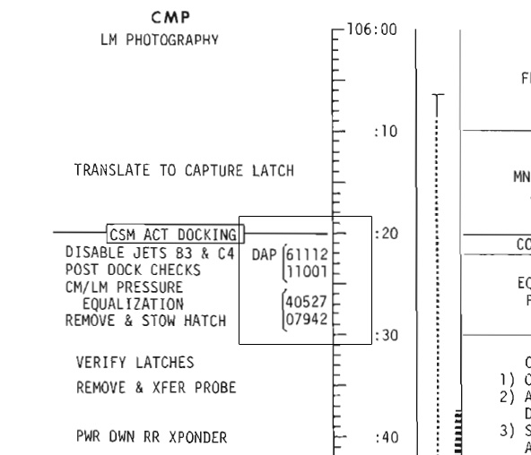 During the braking manoeuvres, the CMP uses P79 to make the Automaneuver to alignment between the two spacecraft in preparation for docking. Once the spacecraft are aligned, P79 displays the range, range rate and angular difference between the CSM's X-axis and the LM.