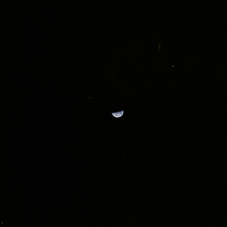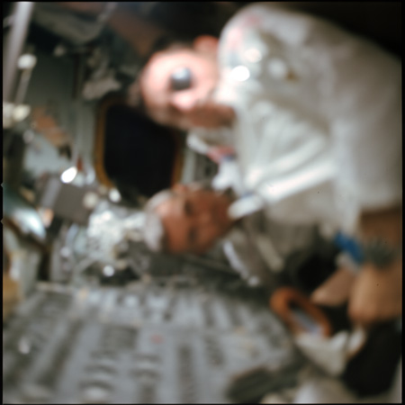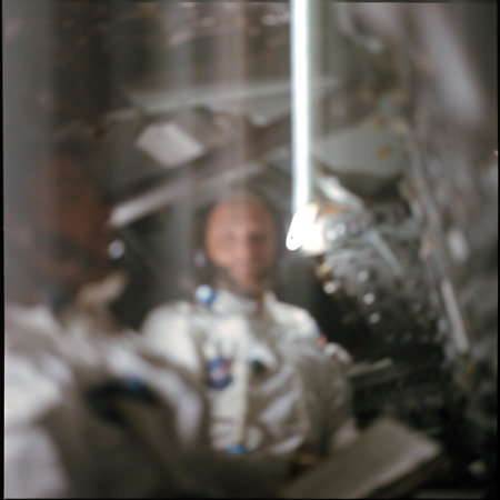145:55:01 Stafford: Roger. 4,800 feet per second [1,460 m/s]. We've got a beautiful view out here of both the Earth and the Moon in our hatches and say every half a rev, we can see both of them for quite a while. And when you get High Gain lock through Goldstone, we'll show them to you for just a couple of minutes. Over.