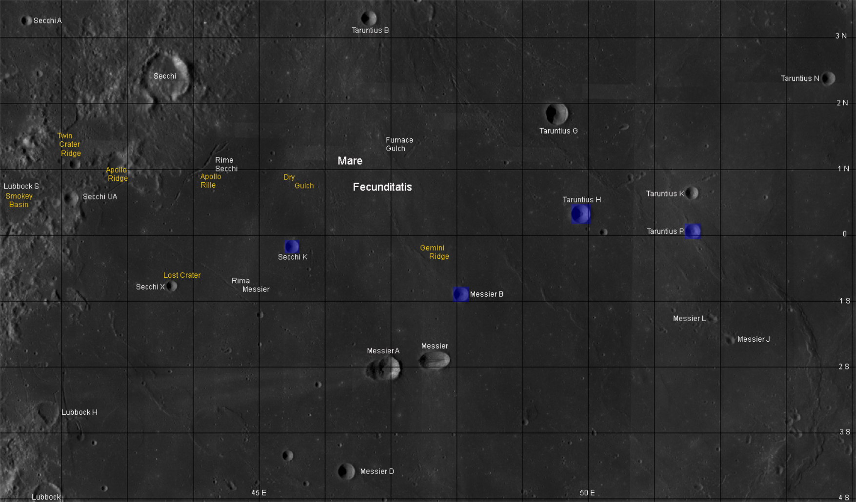 The cislunar landmarks are all in Mare Fecunditatis and are highlighted in this LRO photomap.