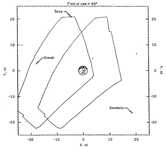 Sextant star: Star 23 (Denebola) visible in sextant when shaft and trunnion angles are 066.9° and 29.7° respectively. This is part of an attitude check.
