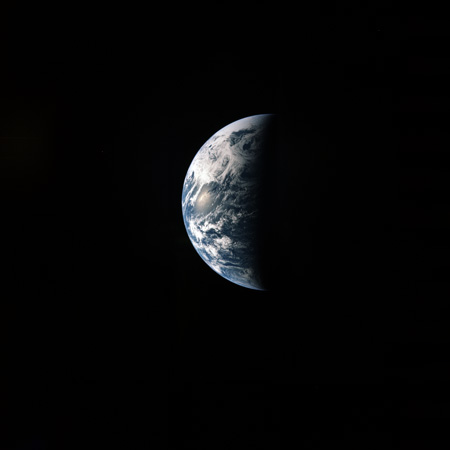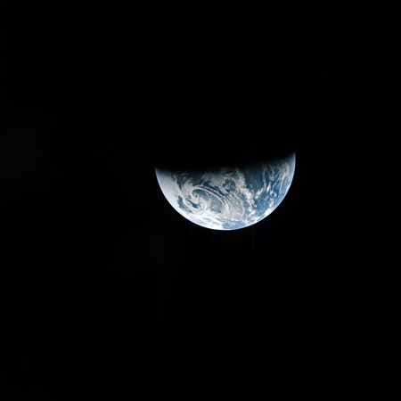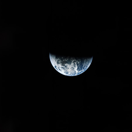 173:36:10 Stafford: OK. Wait just a minute. It's starting to disappear out the left hatch window, and John will take the camera there and go right and take it out through our center hatch window. And here you can see the Earth as it starts to go out the left side window.