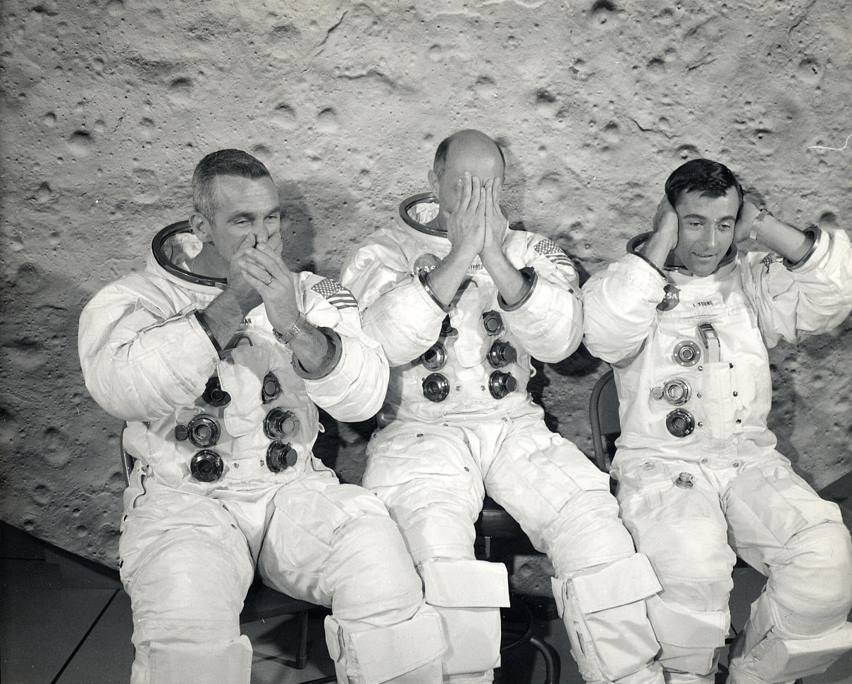 The prime crew of the Apollo 10 lunar orbit mission pose for photograph while at the Kennedy Space Center for preflight training.