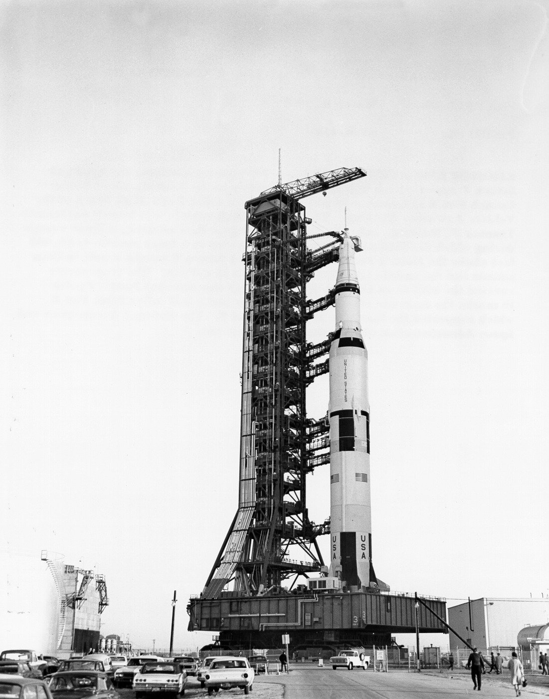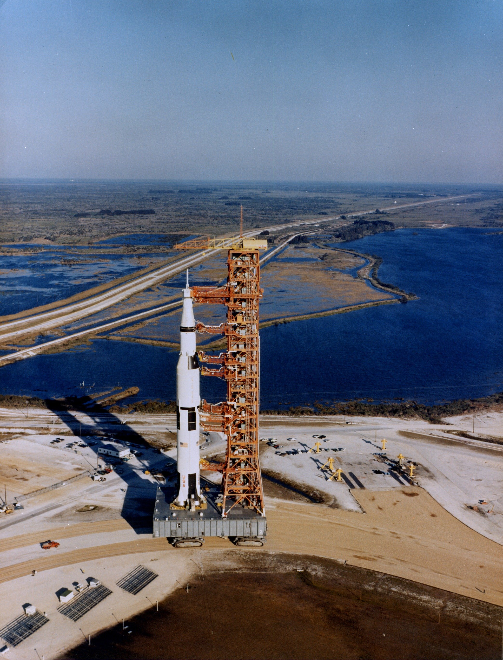 The 363-feet tall Apollo 10 space vehicle on the way from the Vehicle Assembly Building to Pad B, Launch Complex 39, Kennedy Space Center. The Saturn V stack and its mobile launch tower are atop a crawler-transporter.