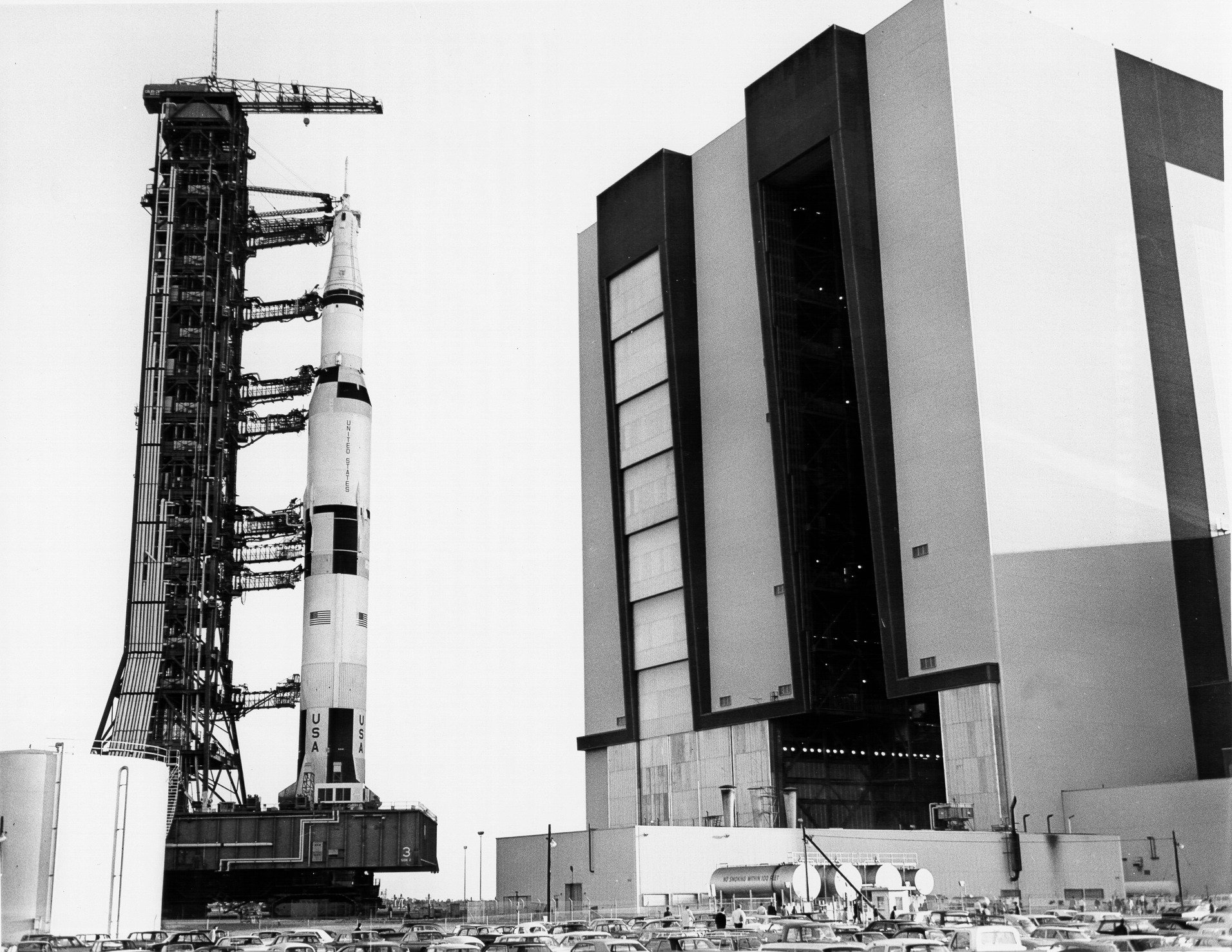 Saturn V / spacecraft stack passing the north side of the VAB enroute to pad 39-B at KSC.