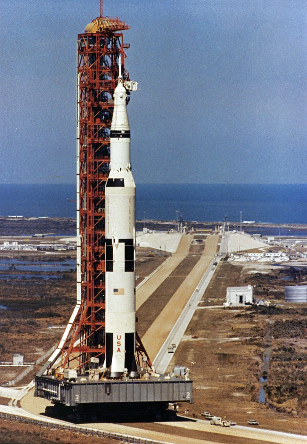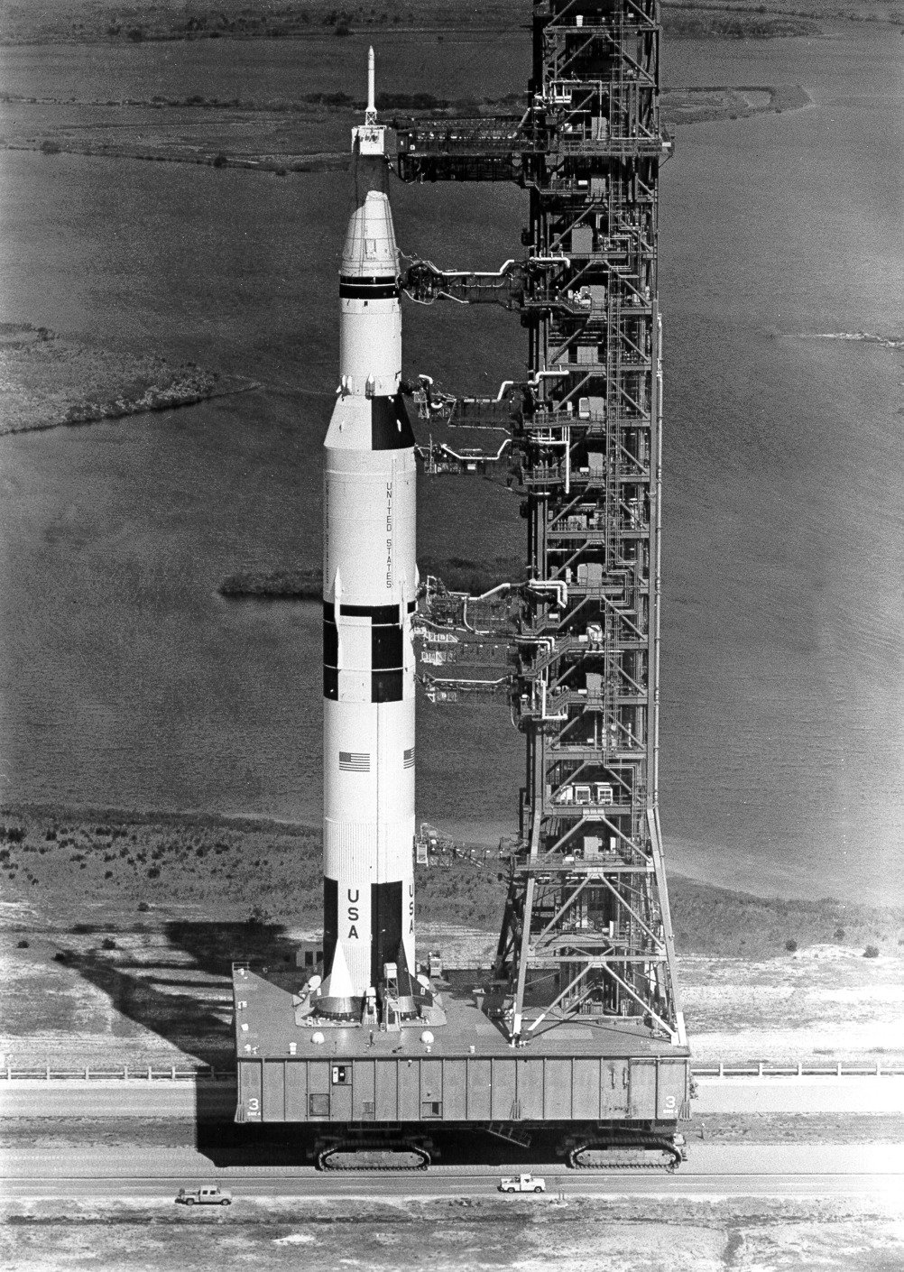 Saturn V during transfer from western doorway of the VAB enroute to pad 39-B.