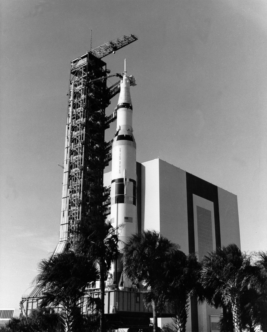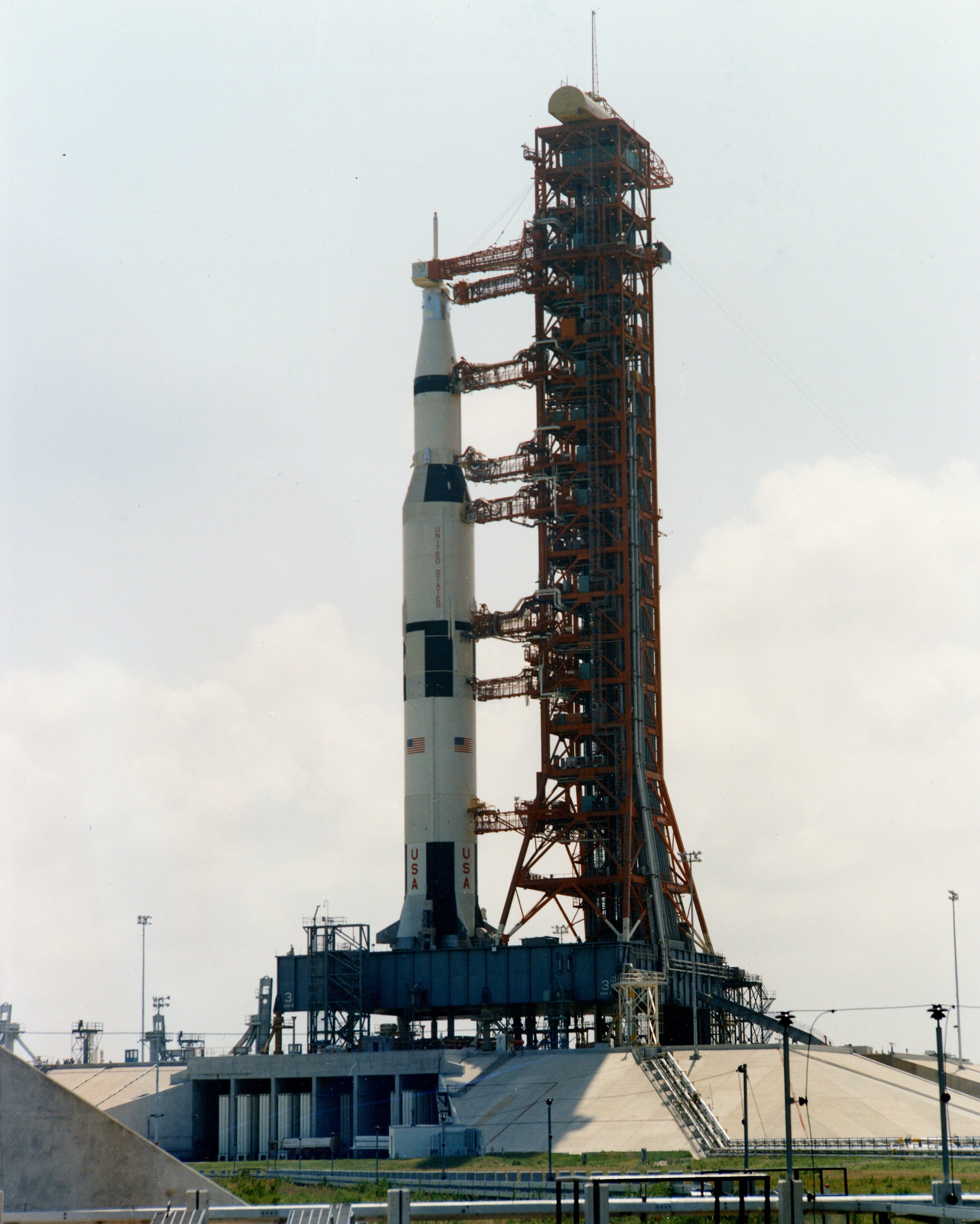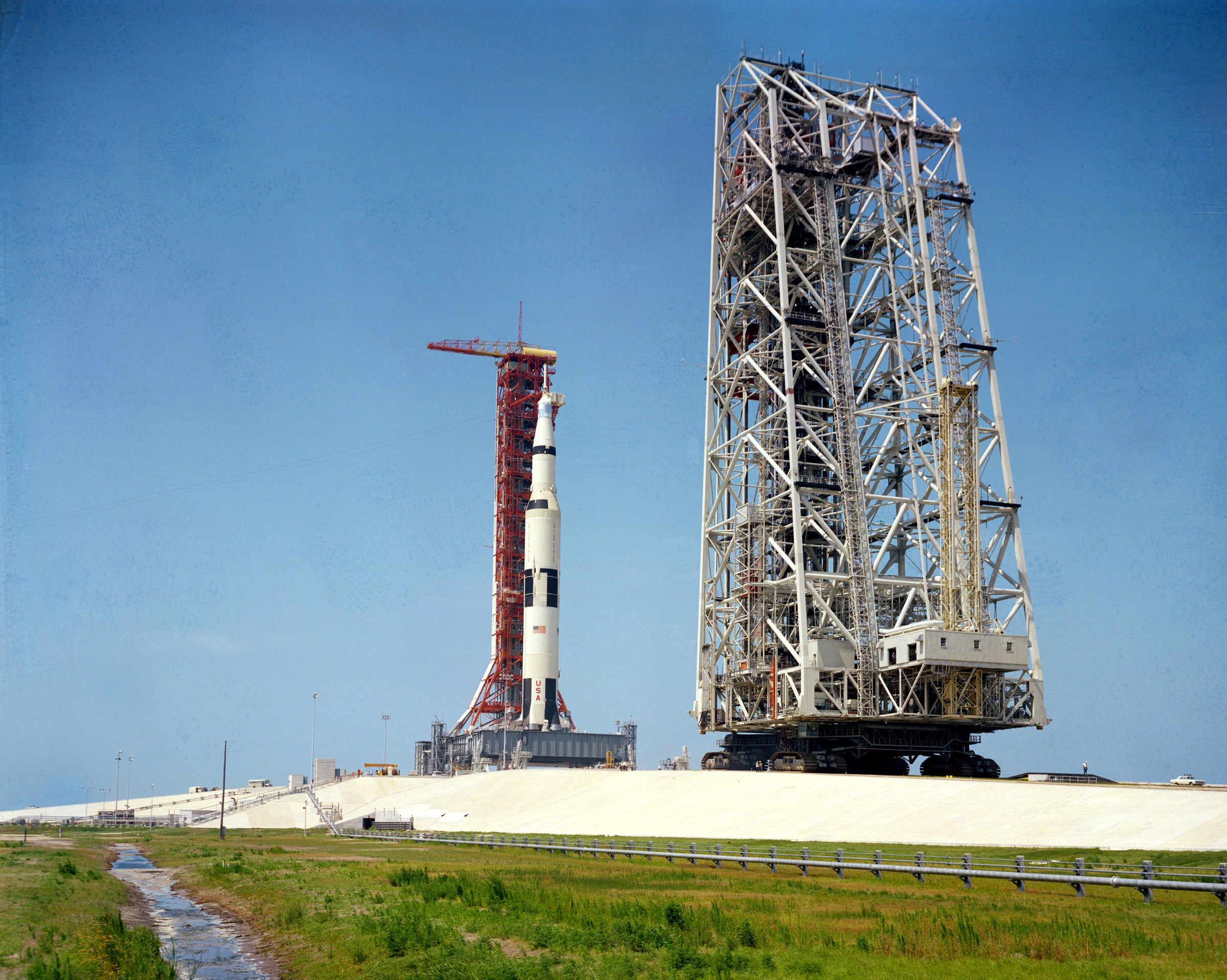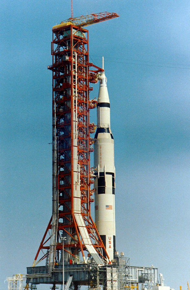Saturn V sitting on pad 39-B at KSC, about to be enshrouded by the MSS.