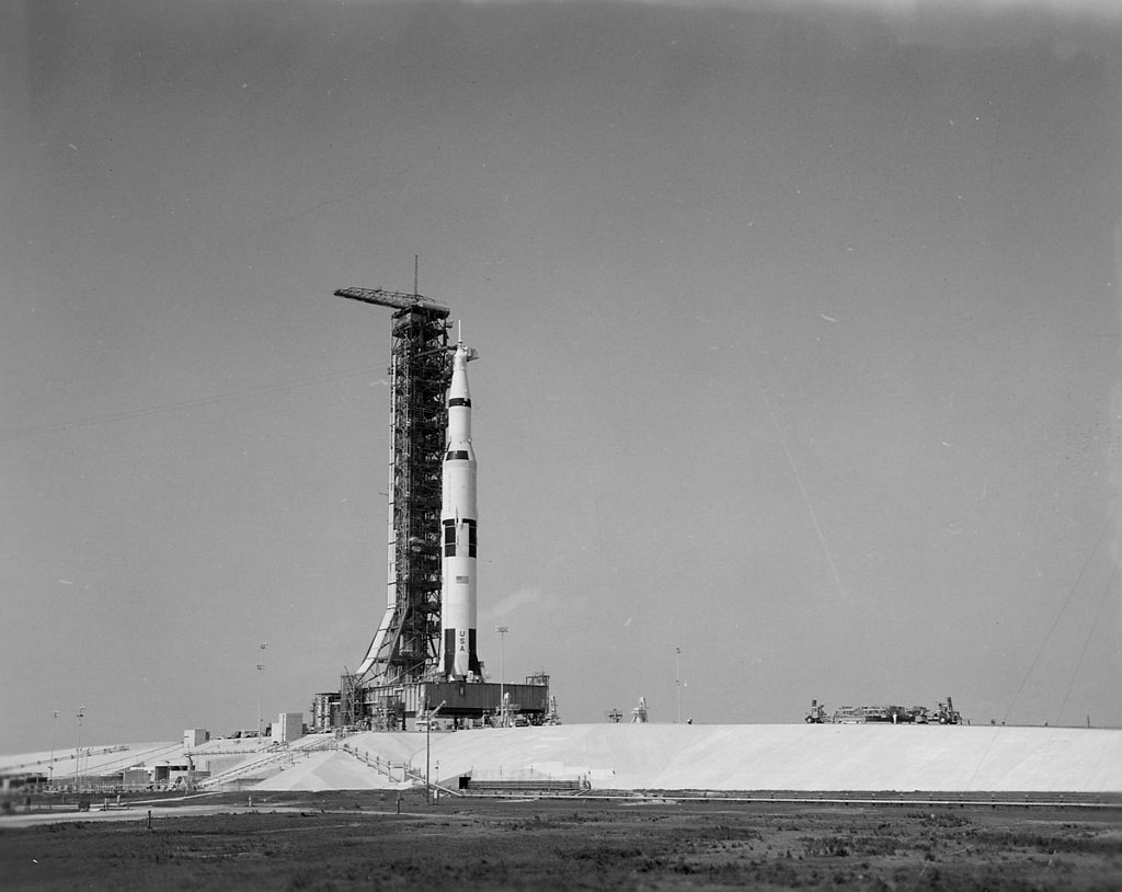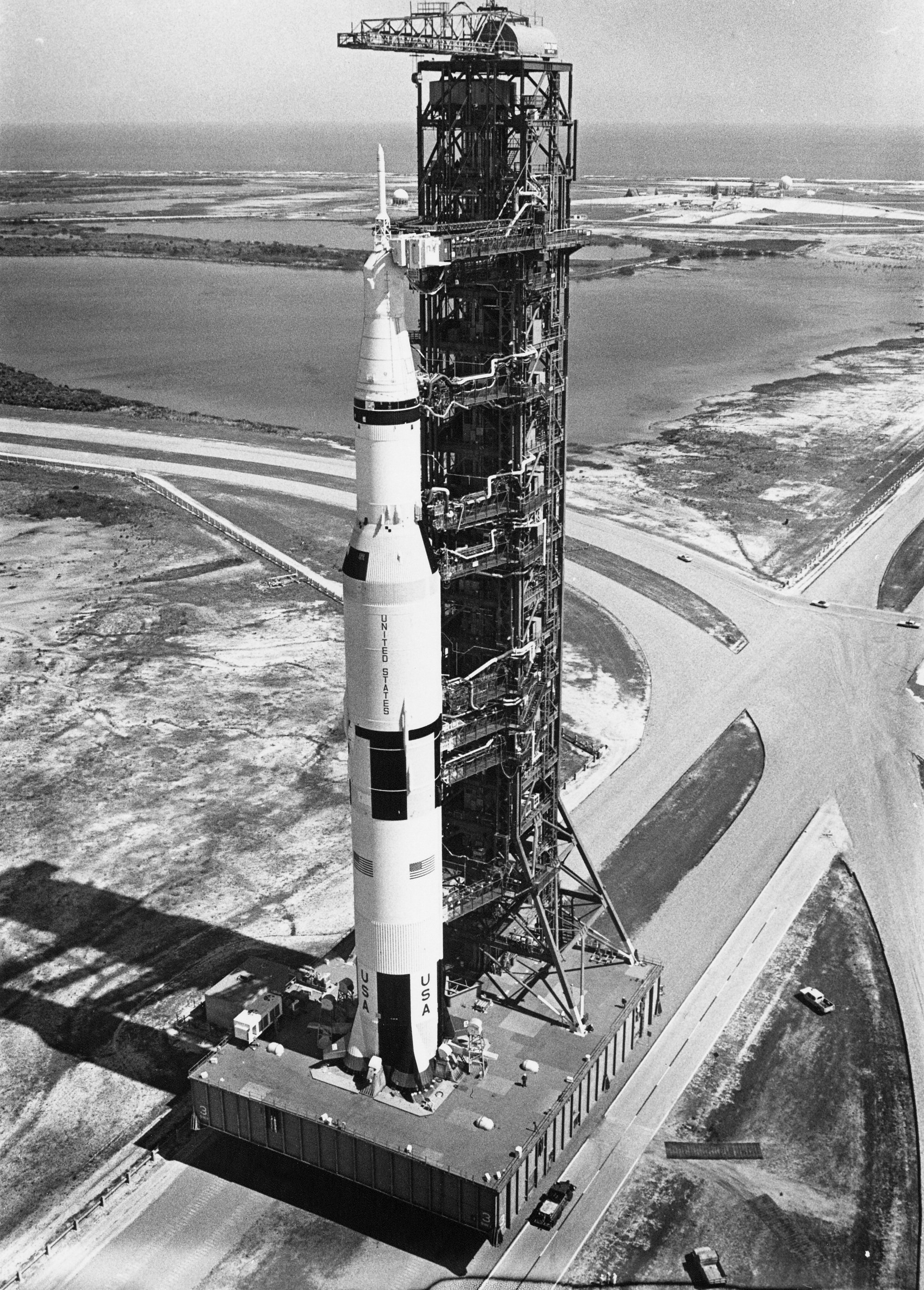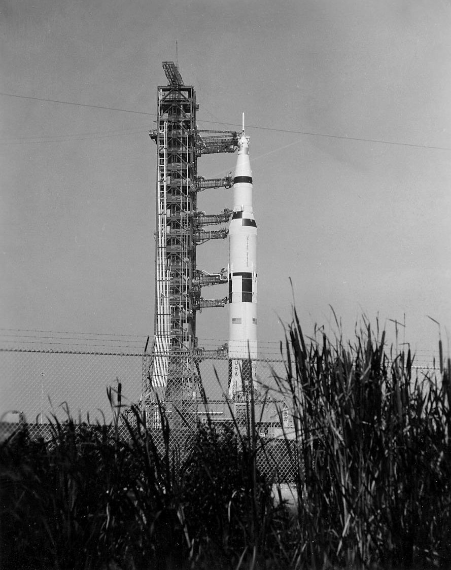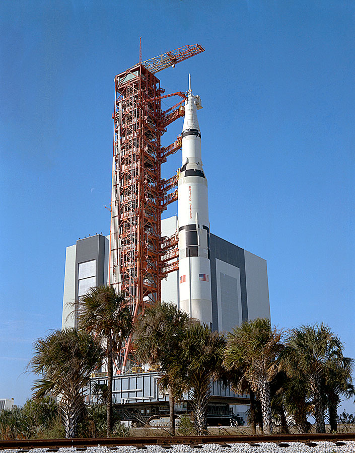 Saturn V sitting on pad 39-B at KSC, about to be enshrouded by the MSS.