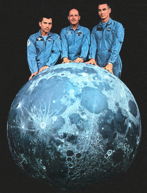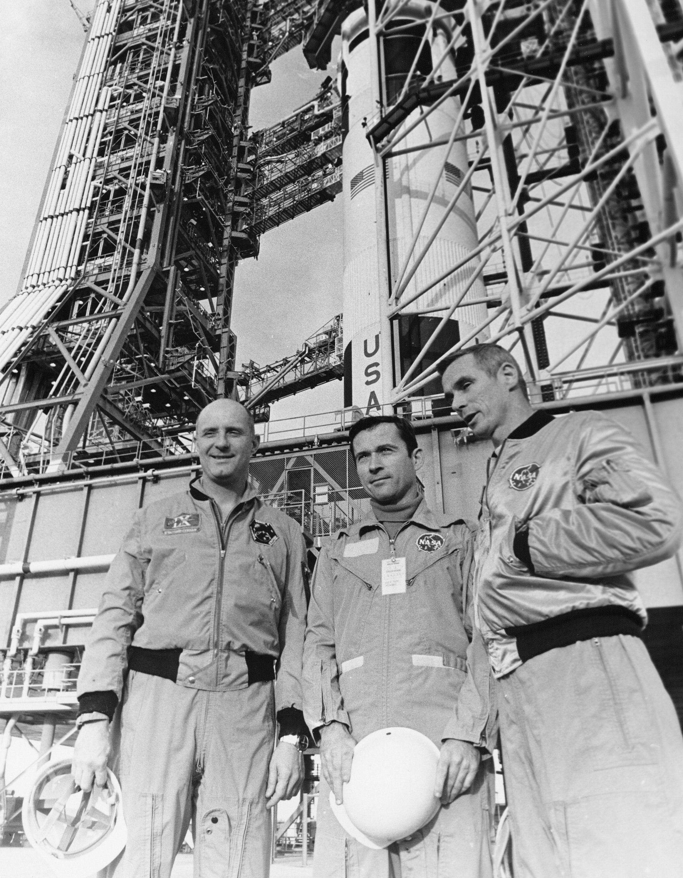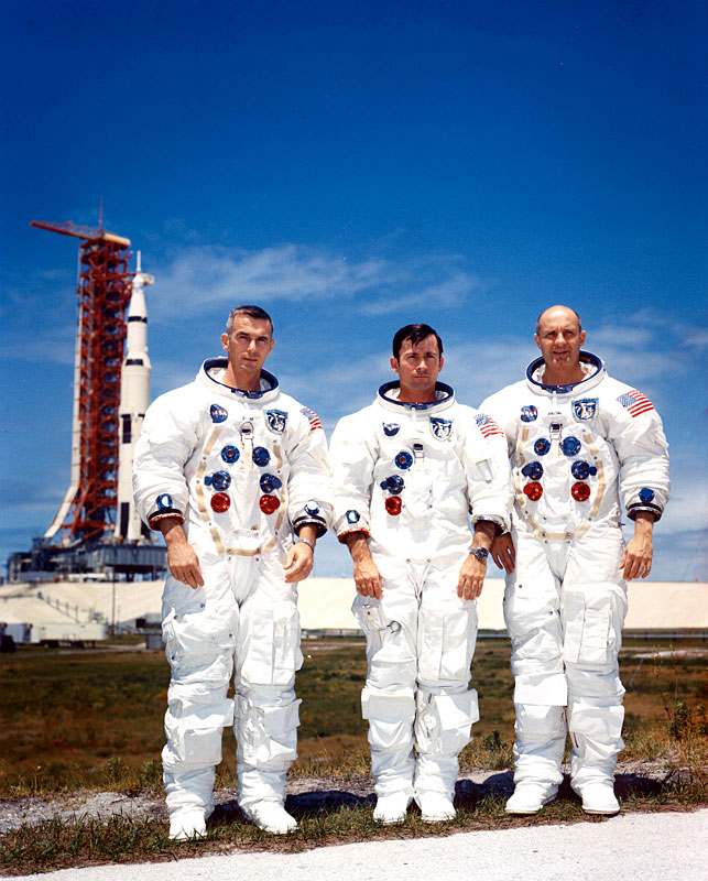 The prime crew of the Apollo 10 lunar orbit mission. Left to right, are Eugene A. Cernan, lunar module pilot; John W. Young, command module pilot; and Thomas P. Stafford, commander. In the background is the Apollo 10 space vehicle on Pad B, Launch Complex 39, Kennedy Space Center, Florida.
