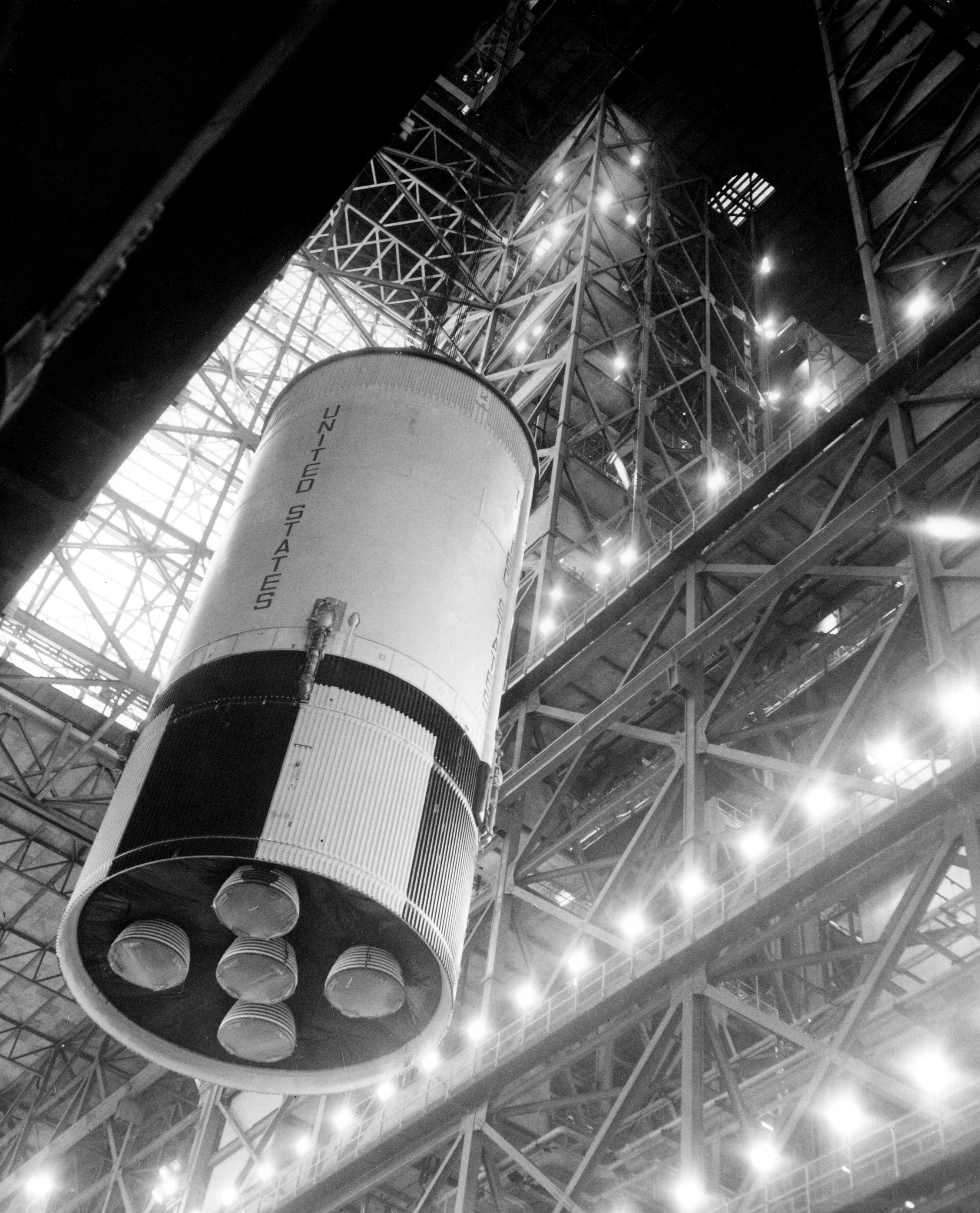 S-IVB third stage is lowered atop the S-II second stage in the VAB.