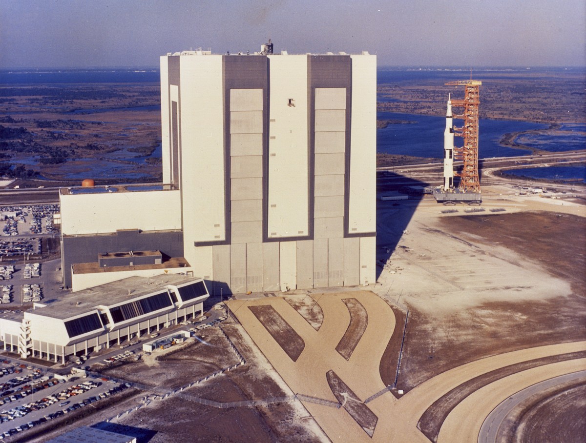 Saturn V passes in front on the VAB on its journey to pad 39-B at KSC.