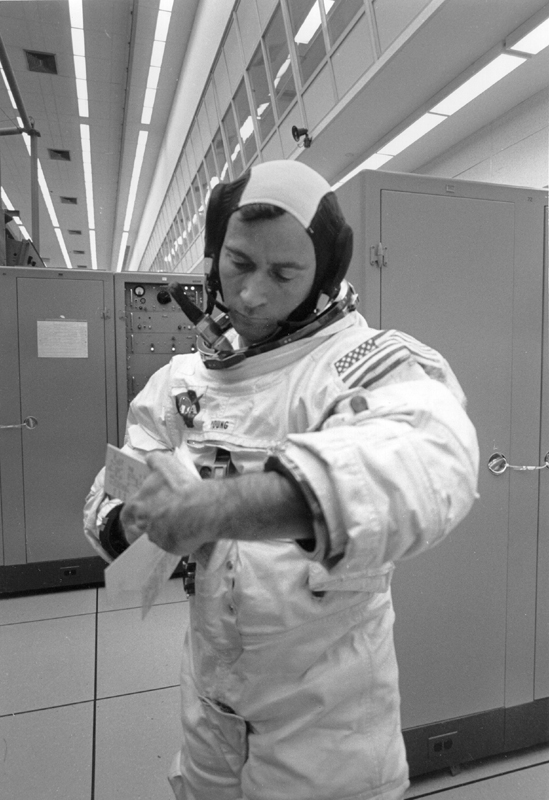 Apollo 10 CMP John Young during crew briefing at pad 39-B at KSC.