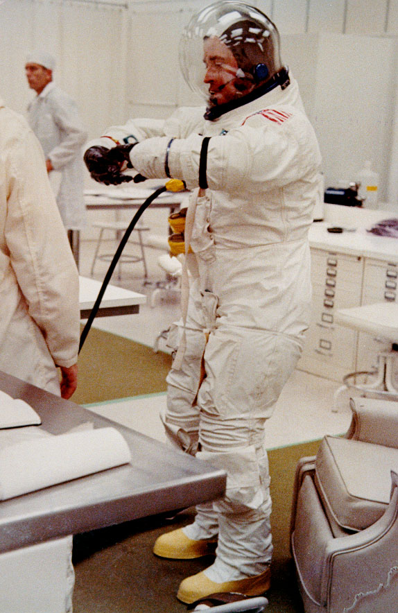 Astronaut Thomas P. Stafford, Apollo 10 commander, is suited up at the Kennedy Space Center for a Countdown Demonstration Test.