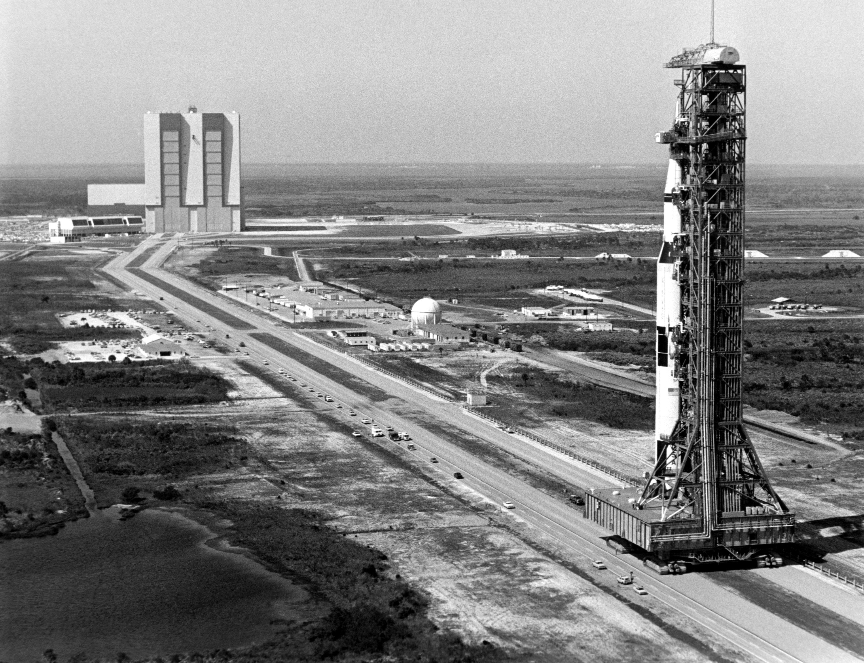 Saturn V journey's along the crawlerway enroute to pad 39-B at KSC.