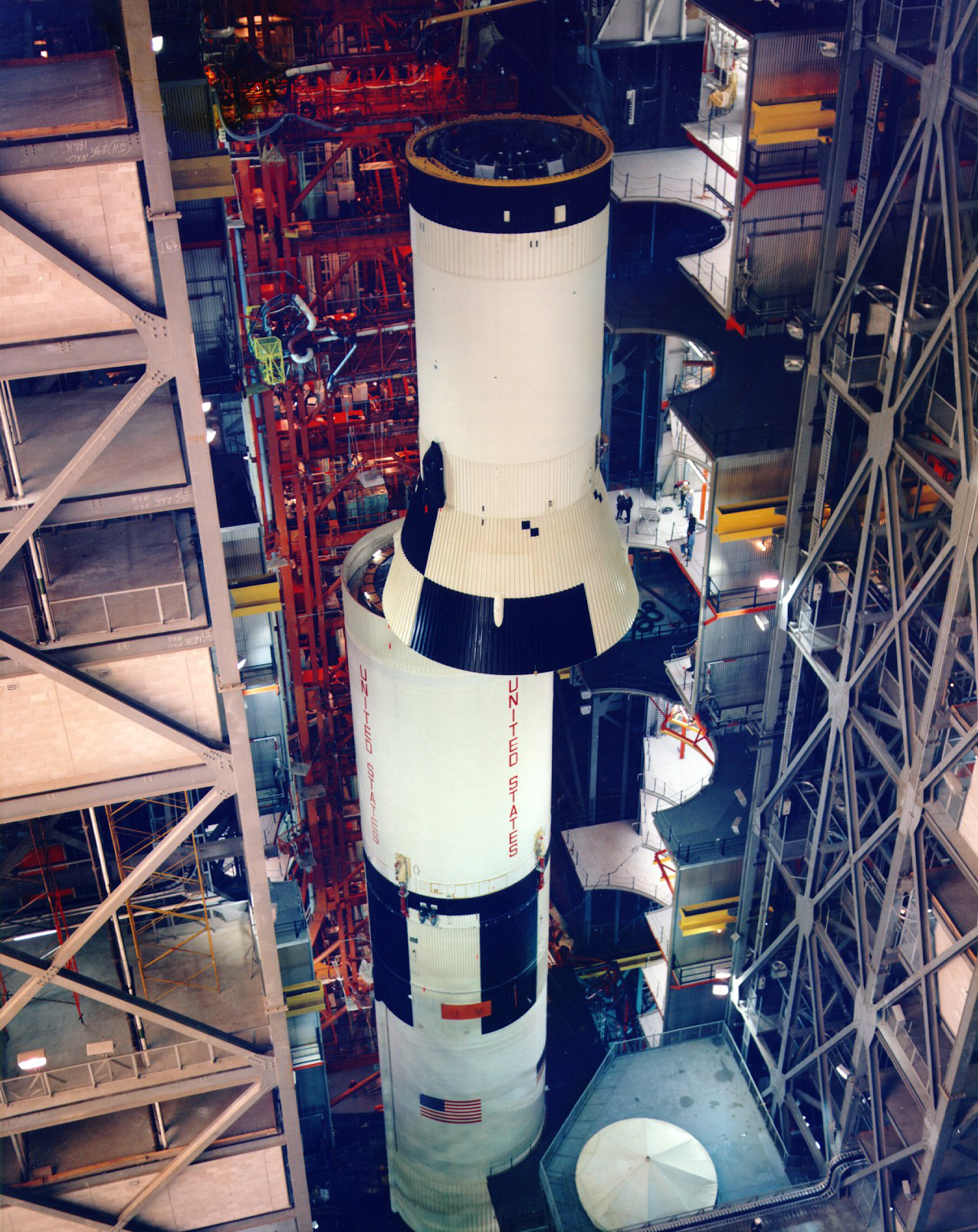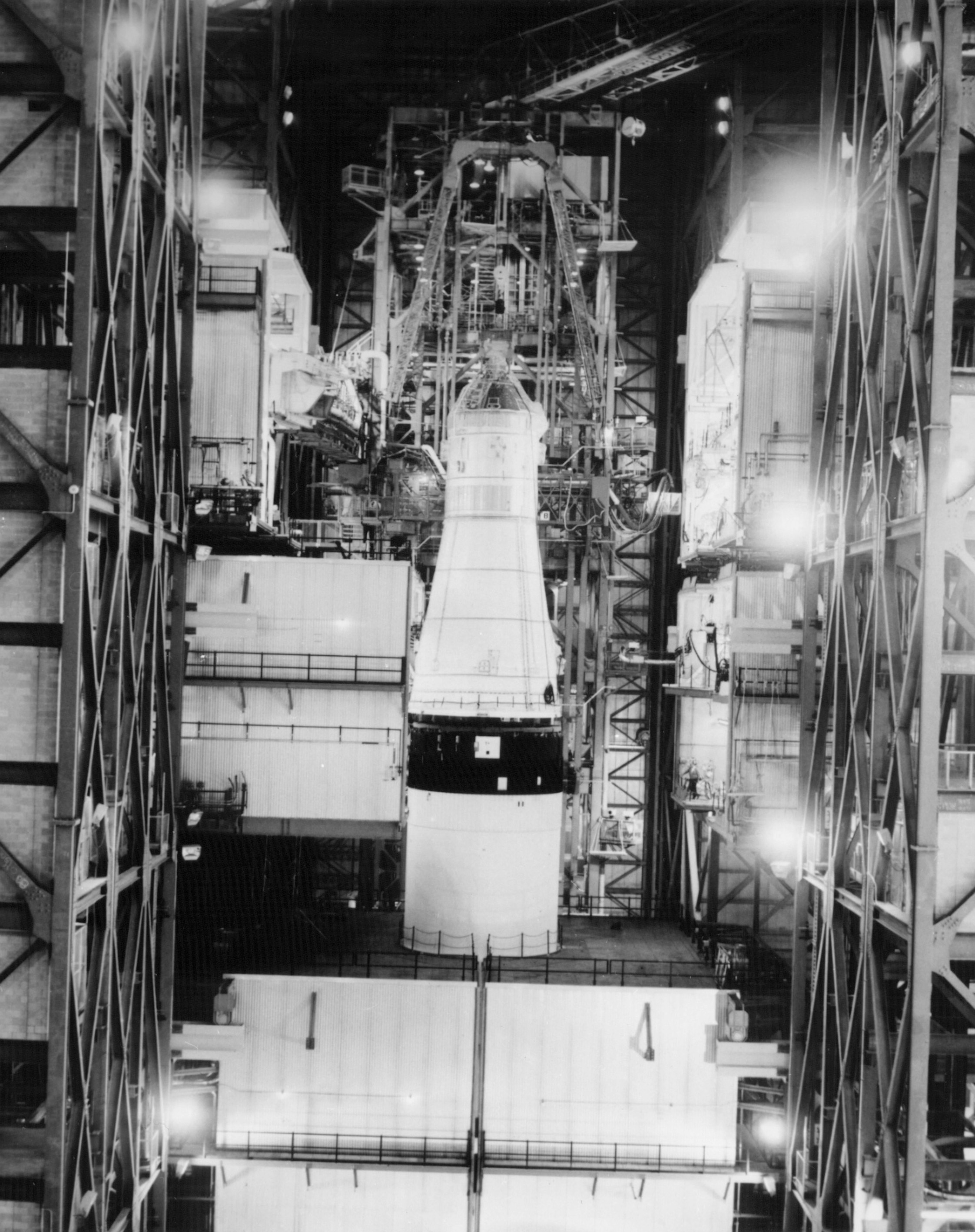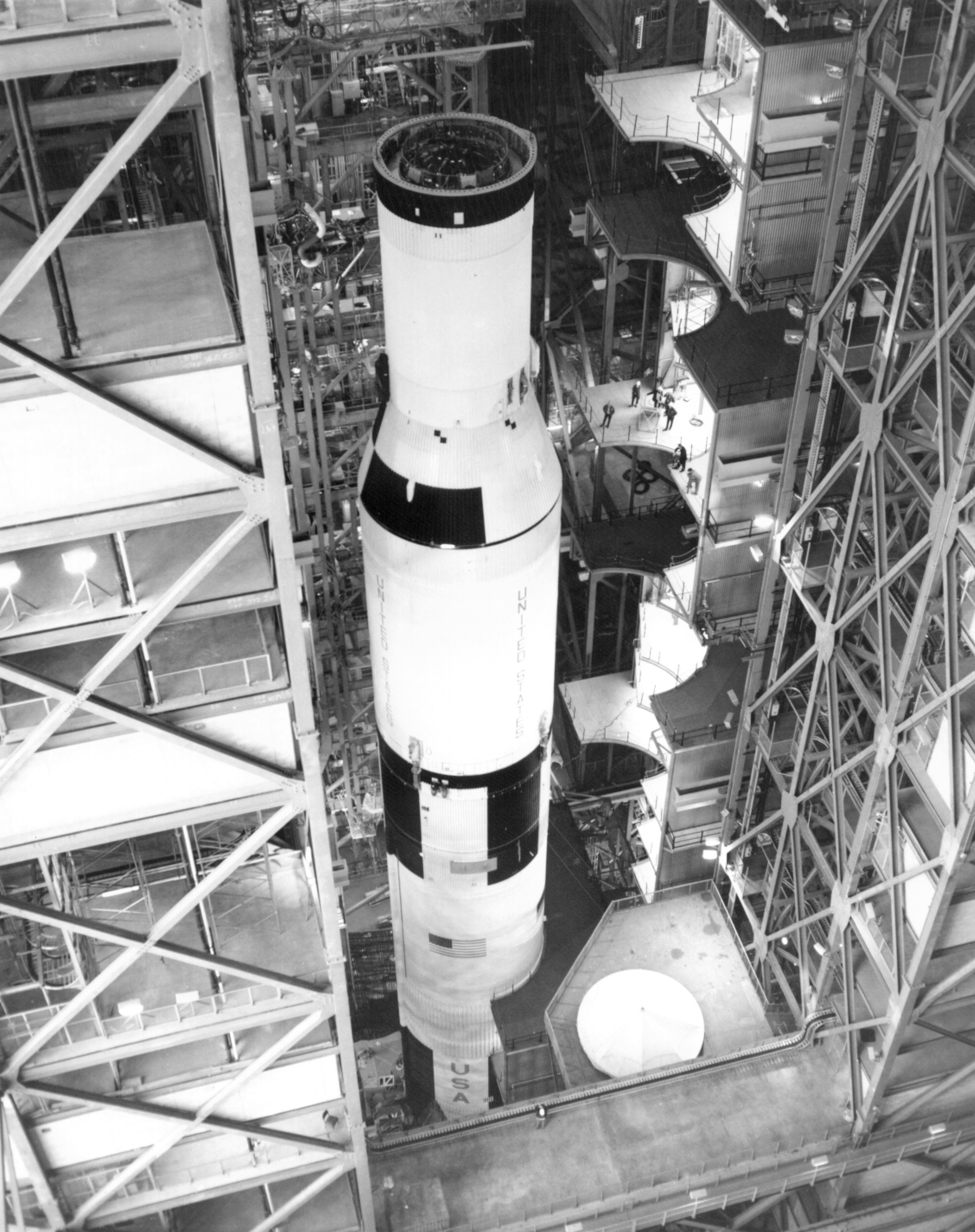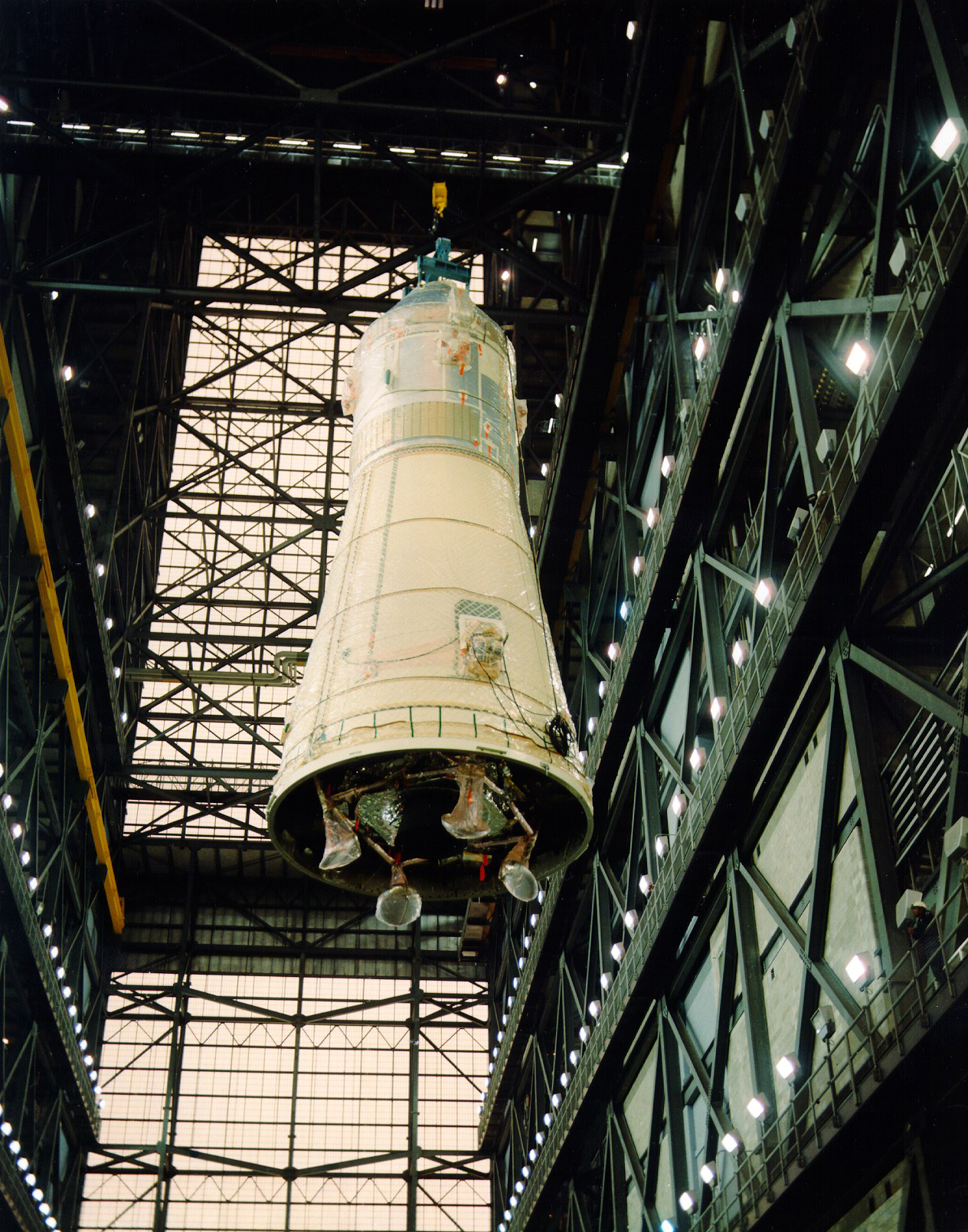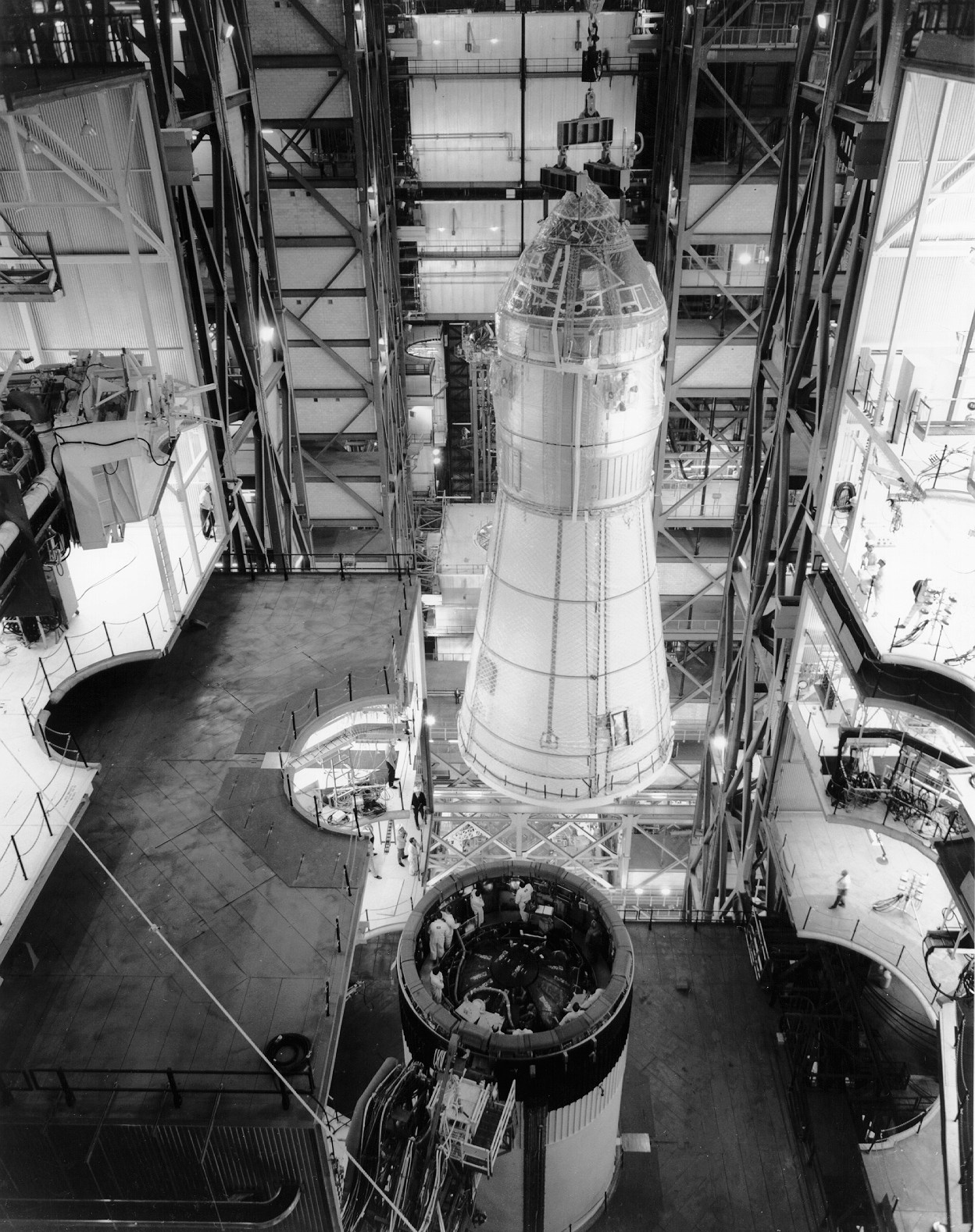 CSM / LM / SLA combination is lowered into place atop the S-IVB / IU in the VAB.